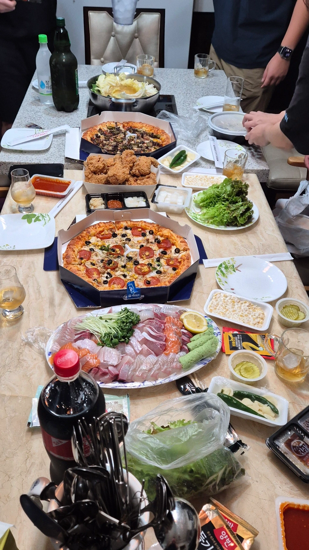 하지만 어제의 모임은 역대 최대 난이도였다. 일곱 명, 최적 인원의 약 175%에 해당하는 수치. 거대한 음식 더미 앞에서, “이걸 다 먹고 살아남을 수 있을까?”라는 생존 본능이 발동됐다. 다행히 음식은 풍족하게 남았고, 우리는 도덕과 욕망 사이에서 “적당히 먹기”라는 형이상학적 미션을 수행했다. 남은 음식은 냉장고의 깊은 동굴로 퇴장했다. 술은 음식의 양에 비례해서 소극적으로 소비되었고, 이로써 숙취 없는 다음 날 아침이라는 현대인의 작은 승리를 획득하게 되었다.