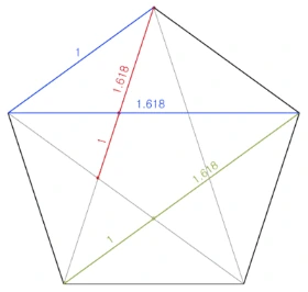 고대 그리스의 수학자 피타고라스는 만물의 근원을 수로 보았다. 그래서 세상의 모든 일을 수와 관련짓는 것을 좋아했다. 그가 생각하기에 혹은 인간이 생각하기에 가장 아름다운 비율을 황금비라고 정해야겠다고 생각했는데, 이것이 그냥 황금비의 유래이다. 위의 그림과 같이 정오각형 안의 별에서 짧은 변과 긴 변의 길이의 비는 1:1.618이다. 피타고라스는 정오각형의 각 대각선은 서로를 황금비로 나누면서, 동시에 가운데 작은 새로운 정오각형을 만든다는 사실을 발견했던 것이다. 고대 그리스에서는 아름다움의 본질을 비례와 질서 그리고 조화라고 생각했기 때문에 이 황금비가 아름답다고 생각했다. 그래서 이 황금비를 안정감 있고 균형 있는 비율로 느끼고 작은 술잔에서부터 큰 고대의 건축물, 신전에 이르기까지 모두 황금비에 딱 맞춰 만들었다.