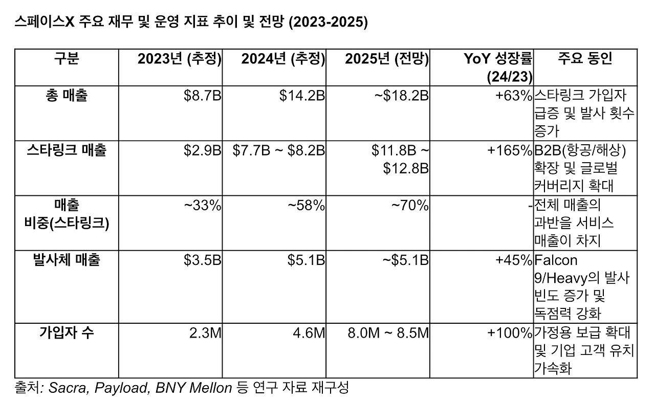데이터 분석 결과, 2024년을 기점으로 스타링크 매출($7.7B)이 발사체 매출($5.1B)을 추월하는 '골든 크로스'가 발생했다. 2025년에는 스타링크가 전체 매출의 약 70%인 128억 달러를 창출할 것으로 예상된다. 이는 스페이스X가 테슬라와 마찬가지로 하드웨어(사용자 단말기) 보급을 통해 소프트웨어/서비스(구독료) 매출을 창출하는 '반복 매출(Recurring Revenue)' 모델을 완벽하게 구축했음을 의미한다.