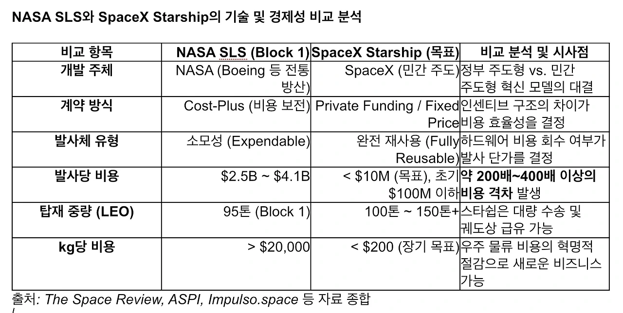 우주 산업의 판도를 바꿀 가장 결정적인 변수는 발사 비용의 혁명적인 절감이다. NASA의 SLS(Space Launch System)와 스페이스X의 스타쉽(Starship) 간의 비교는 구체제(Old Space)와 신체제(New Space)의 철학과 경제성 차이를 극명하게 보여준다.