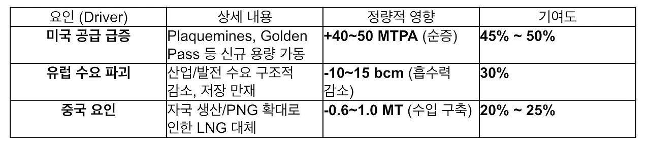 본 가중치 평가는 단순한 정성적 추정이 아닌, IEA(국제에너지기구)와 Kpler, EIA(미국 에너지정보청)의 2026년 수급 전망 데이터를 기반으로 산출된 '시장 잉여 물량'의 물리적 구성비를 근거로 한다. 2026년 발생할 것으로 예상되는 총 잉여 물량(약 7,000만 톤 내외 추산) 중에서 미국발 순증 공급량(약 4,000~5,000만 톤)과 유럽·중국의 수요 감소 및 대체 물량(약 2,000~3,000만 톤)이 차지하는 비중을 역산하여 각 요인의 기여도를 도출하였다.
