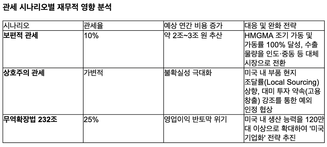 미국 행정부가 모든 수입품에 대해 10%의 보편적 관세를 부과하거나, 한국산 자동차에 대한 상호주의 관세를 적용할 경우, 한국에서 생산해 미국으로 수출하는 물량(전체 대미 판매의 약 30~40% 수준)은 가격 경쟁력을 상실하게 된다.