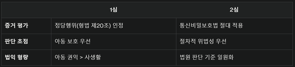 이처럼 2심은 발언의 내용·맥락 자체보다 증거 수집 과정의 적법성에 집중하여 판결을 내렸다. 재판부는 "녹음파일 없이는 학대 사실을 입증할 수 없다"는 논리로 무죄를 선고했으나, 이는 발언이 학대가 아니라는 실체적 판단이 아니라 증거 부족에 따른 절차적 판단이다.