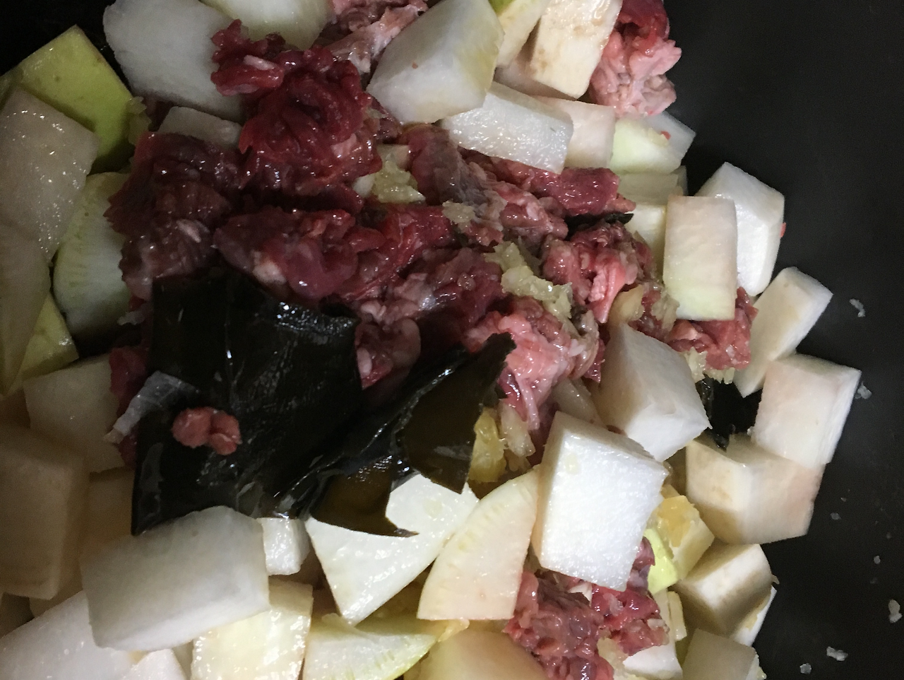 탕국 재료 삼총사인 소고기, 무, 다시마가 마늘과 참기름에 달달 볶아지는 냄비 옆에서는 물이 팔팔 끓고 있다. 요게 엄마 탕국 레시피의 기술이다. 뜨거운 물을 4회에 걸쳐 보충하듯이 넣어 고기 노린내를 휘발시킴과 동시에 다시마로 인한 끈적한 감칠맛을 용해시킨다. 참 묘하게도 이 과정을 거치고 나면 탕국은 맑아지고, 입맛 돋우는 기분 좋은 단맛과 감칠맛이 국물을 지배하기 시작한다.