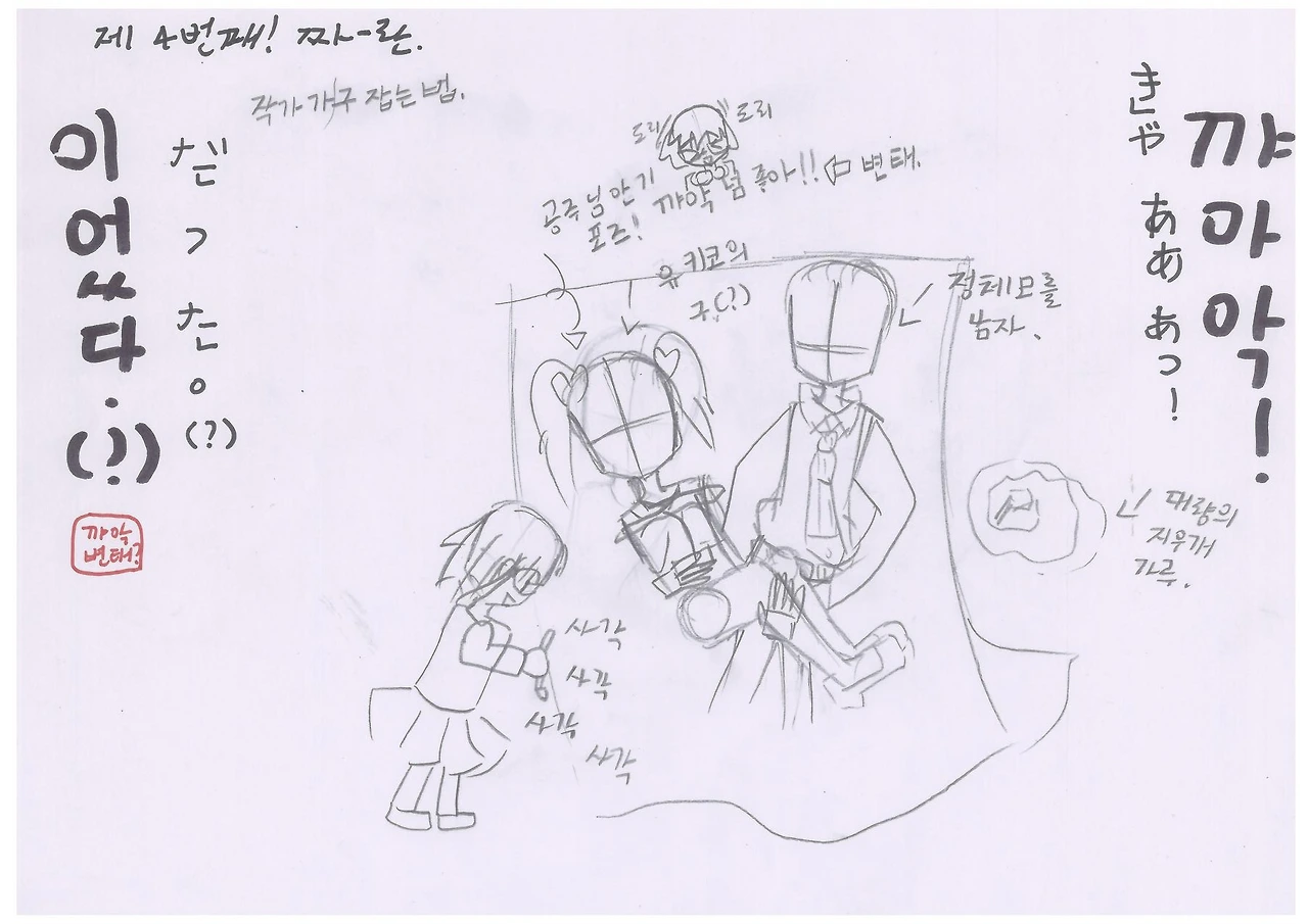 그림 그리는 작가 캐릭터가 실제 딸아이와 너무 똑같아서 놀랐다. 작화 후 나오는 대량의 지우개 가루도 똑같다. 매주 토요일 아침 일주일에 한 번 대청소 날, 나는 청소기를 들고 딸아이 방에 들어간다. 가루는 휴지통 주위로 수북이 쌓여있다. 휴지통에 들어가다 옆으로 흩날린 가루. 휴지통을 기점 삼아 원을 그리듯 지우개 가루는 벽 쪽에 침대 쪽에 책상 쪽에 골고루 흩어져 있다. 나는 어떻게든 청소기를 갖다 대 가루를 빨아들인다.