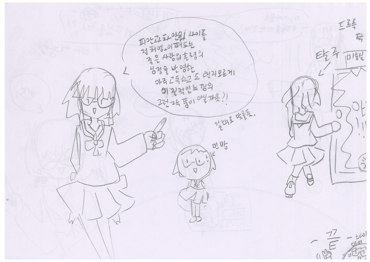 삼색 볼펜과 붓을 들고서 꺄울~~ 쪽팔려어어어~~를 외치는 작가.