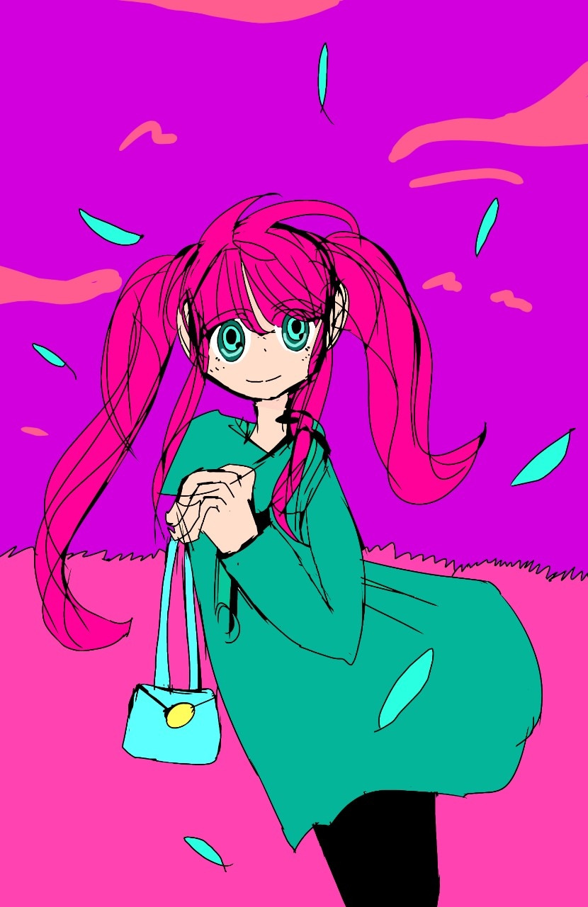 어느 풀밭에 여자애역동적인 표정으로 카메라를 보네요.