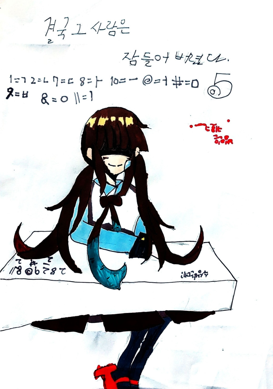범인이었다. 아니, 지금부터 범인이 될 것이다. 내가 손을 뻗자, 앞으로 앞으로 소름 돋는 기운이 퍼져나가고... 결국 나는 한 명의, 그러니까 이승에서 사는 인간으로서의 존재가 아닌, 저승에서 죽어가는 한 괴물이 된 것이다. 사실 내가 누구인지도 기억 못 한다. 그저 새빨간 복도와 '그'계단이 눈앞에 아른거리며 나를 잡아당기려 하고 있을 뿐이었다. 그리고 나는 노래를 부른다. 가만히 내 눈앞에 보이는 소름 끼치는 것들을 보며, 물음표? 하고 정체를 감출 거니? 그렇게 계속 '죽은 새'를 떠나보낼 거니? 마음대로 해, 어차피 너는 범인이니까. 생각대로 해. 어차피 너는 괴물이니까. 빨간빛을 띠고서. 그렇게 홀려 본능으로만 살아가는 거야. 다시 한번 말할게. 물음표? 하고 정체를 감출 거니? 범인은? 야!