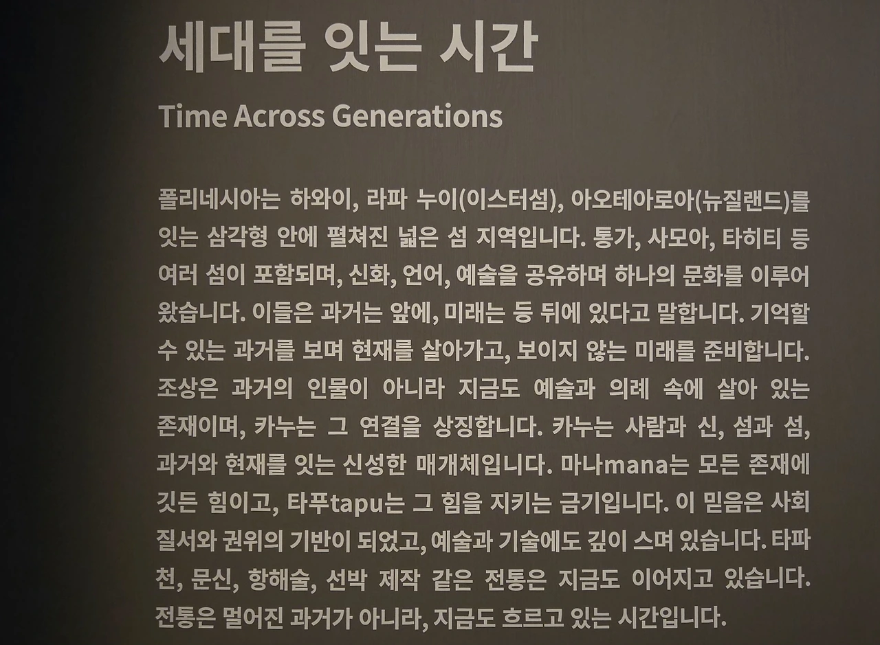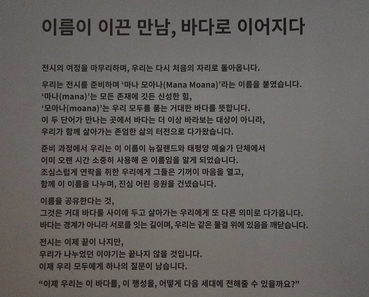 폴리네시아어로 ‘마나mana’는 모든 존재에 깃든 신성한 힘을, ‘모아나moana’는 거대한 바다를 뜻합니다. 신성한 바다를 삶의 터전이자 연결의 공간으로 삼은 이들에게 ‘마나’는 삶과 자연, 조상을 존중하는 마음의 근원이자 세상을 움직이는 힘입니다. 이러한 마나의 세계관은 자연을 비롯한 모든 존재를 단지 이용의 대상이 아닌 공존의 동반자로 바라보는 깊은 깨달음을 전합니다. 이제, 지구라는 섬 위에서 인간이 이룬 다양한 문화를 만나고자 합니다. '마나 모아나'와 함께 공감과 여운 가득한 시간 되시길 바랍니다.
