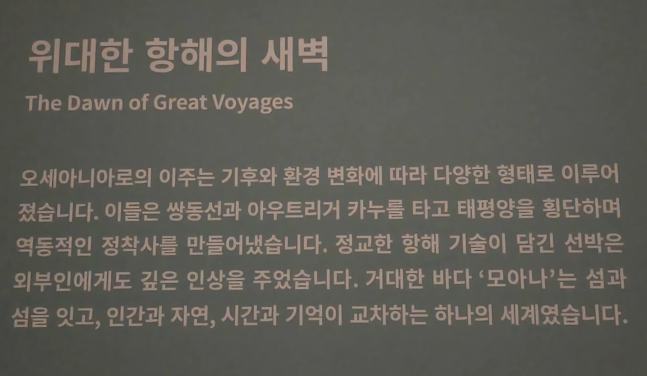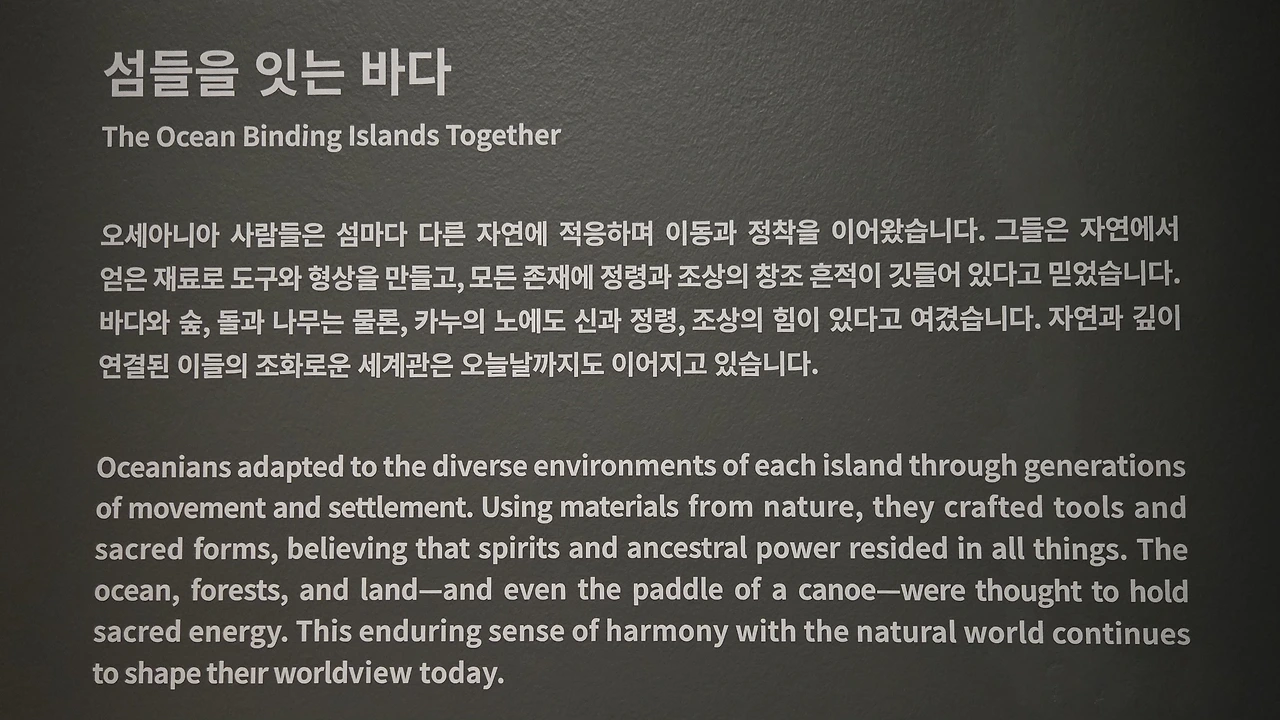 지구 표면의 3분의 1. 모든 육지를 합한 것보다 더 큰 바다. 바로 태평양입니다. 이 거대한 바다에서 인간은 배를 띄우고, 섬을 찾고, 자신의 뿌리를 만들었습니다. 태평양에 흩뿌려진 수많은 섬에서 인간이 창조한 예술과 문화, 물질문화를 총칭하여 ‘오세아니아’라 부릅니다. 섬과 섬 사이를 길로 삼아 항해해 온 사람들, 그들이 별과 바람과 해류를 따라 만든 이 세계에는 독창적인 예술과 철학 이야기가 펼쳐져 있습니다.