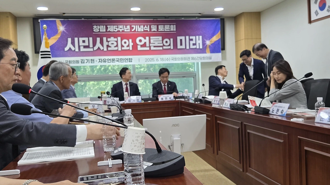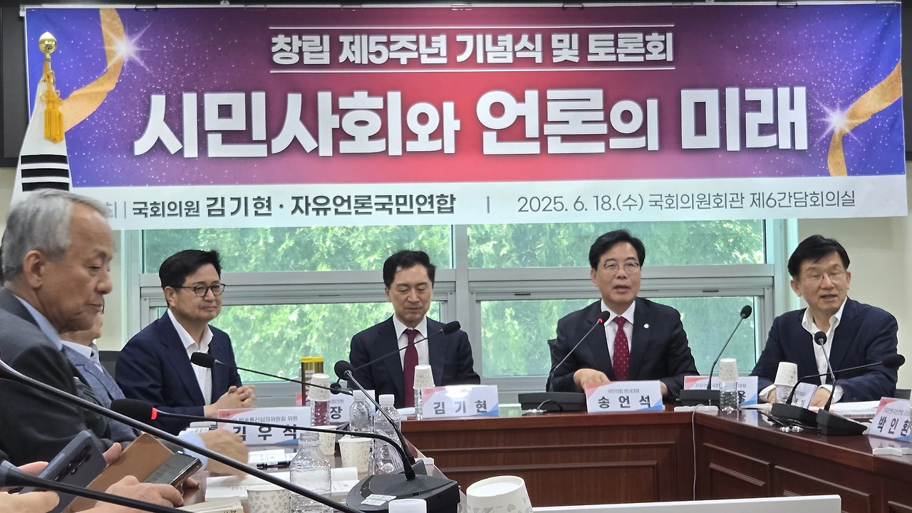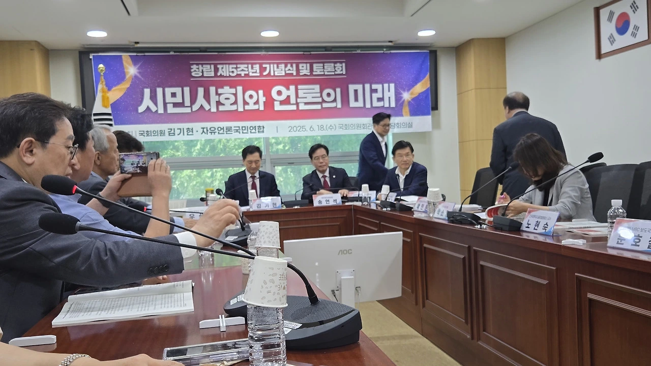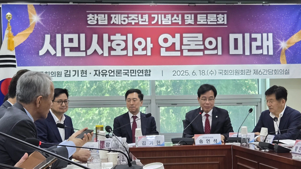 이날 열린 자유언론국민연합 5주년 창립 기념토론회에는 국민의힘 송언석 신임 원내대표, 김기현 의원, 김장겸 의원 등과 언론학계 주요 교수진과 현장 실무자들이 참석했다.
