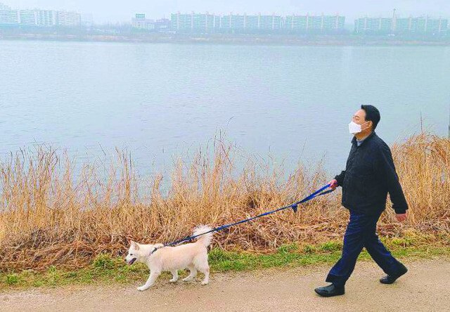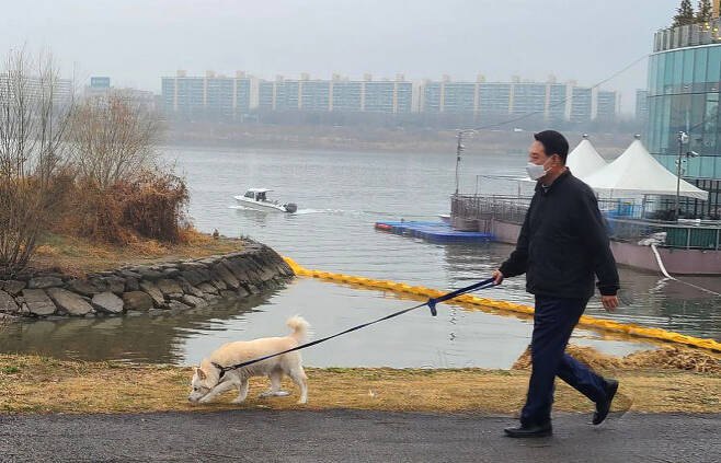 퍼스트 도그 토리, 대통령 당선인 아빠 윤석열 줄잡고 한강변 산책하다