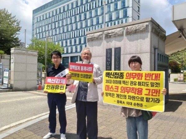 'K-방역 영웅' 정은경···'직권남용'으로 고소 당했다. 손현준(충북대 의대 교수, 가운데) 백신인권행동 대표와 관계자들이 지난 2022년 6월8일 오후 청주지검 앞에서 정은경 전 질병청장 등 보건당국 관계자 4명을 직권남용·직무유기·배임 혐의로 고소하는 내용의 기자회견을 열고 있다.사진=연합뉴스