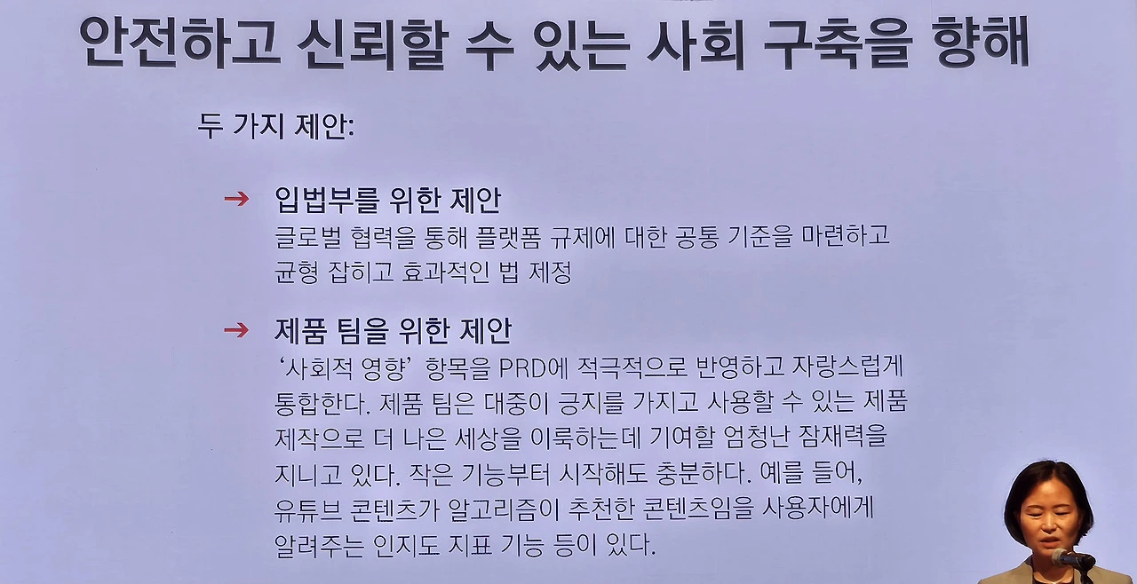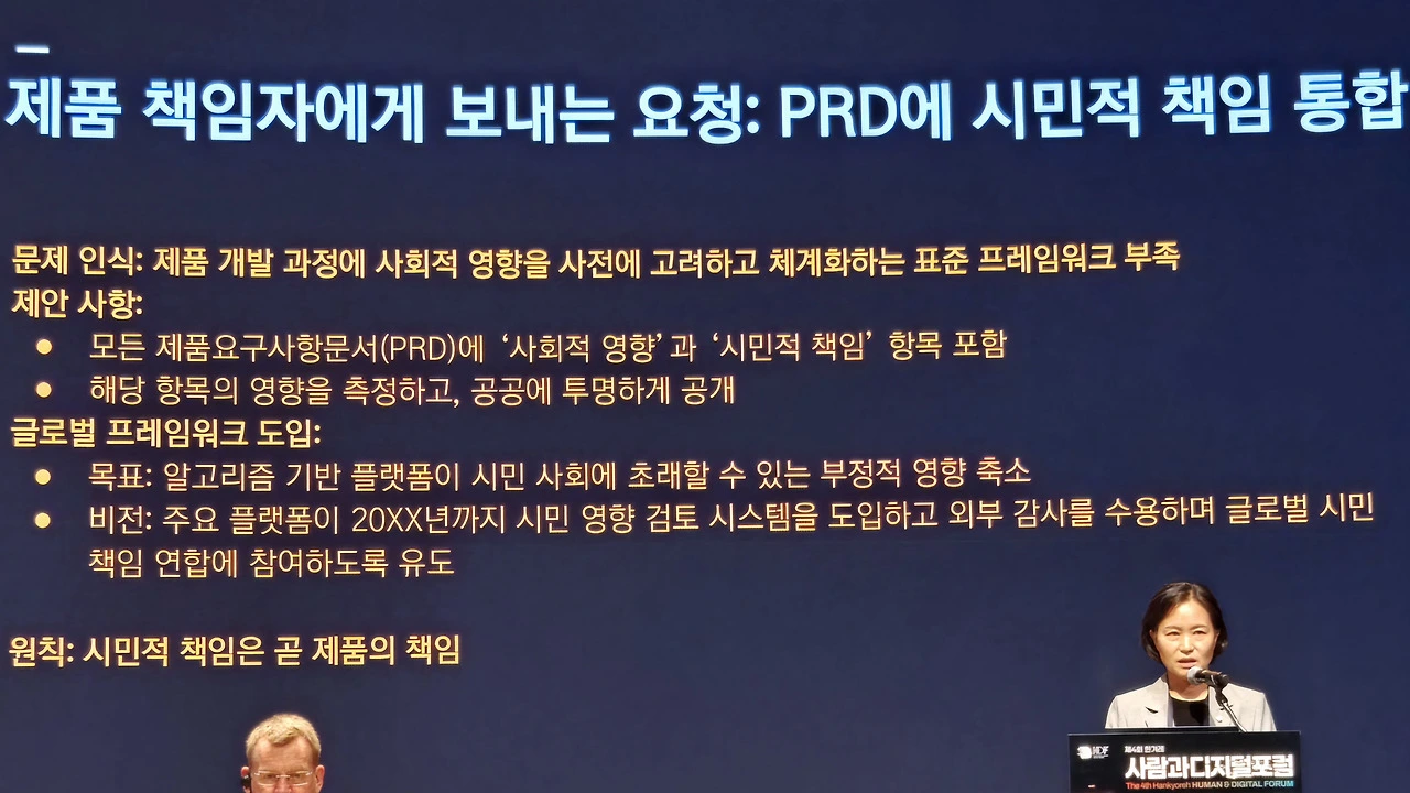 또한 그는 플랫폼 기업의 자율적 책임도 강조했다. 제품 기획 문서(PRD)에 시민적 책임 항목을 명시하고, 소셜 임팩트를 사전에 점검하는 문화를 확산시키자는 것이다. 이해민 의원은 "유튜브의 자동 추천 시스템처럼 반복적 소비를 유도하는 기능에는 경고 인디케이터를 탑재하는 등 구체적인 기능 설계가 필요하다"며 자신이 작성 중인 시민책임 기반 PRD 초안을 큐알코드를 통해 공개하고, 전 세계 기술자들이 이를 함께 완성해 나가길 바란다고 덧붙였다.