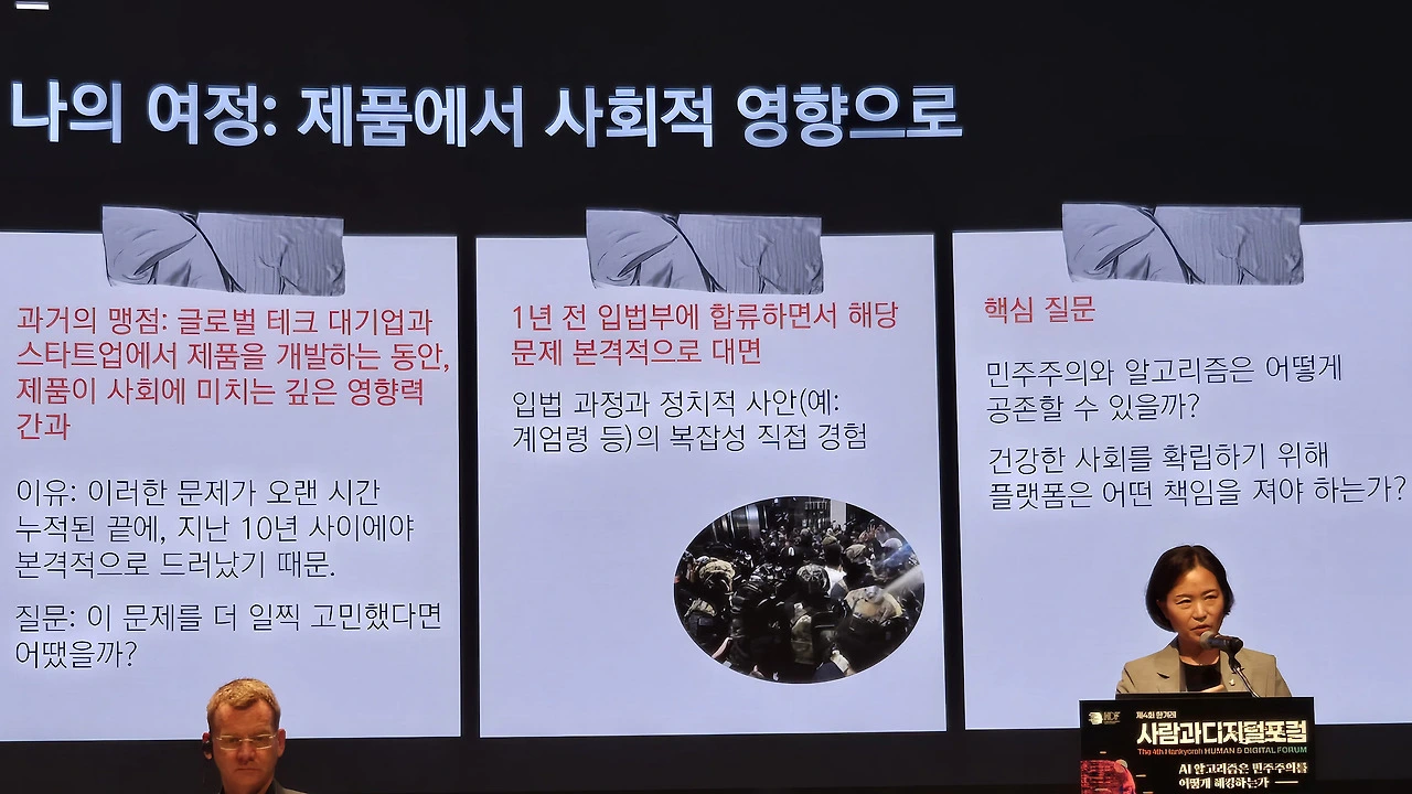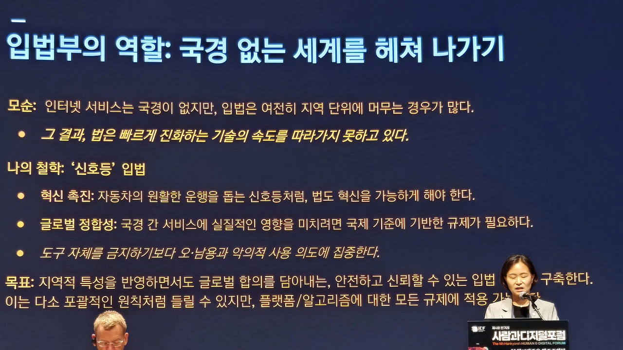 그는 구글에서 프로덕트 매니저로 일했던 경험을 바탕으로, 클릭률 중심의 알고리즘 설계가 사회적 신뢰를 훼손한 사례를 짚으며 "입법은 각국의 특수성을 반영하되, 국경을 넘는 디지털 서비스에는 국제 규범 기반의 조율이 필수"라고 말했다. 특히 법은 너무 느리고 기술은 너무 빠르다는 인식 속에서 '신호등 같은 입법'을 통해 기술 발전과 규범의 균형을 이뤄야 한다고 제안했다.