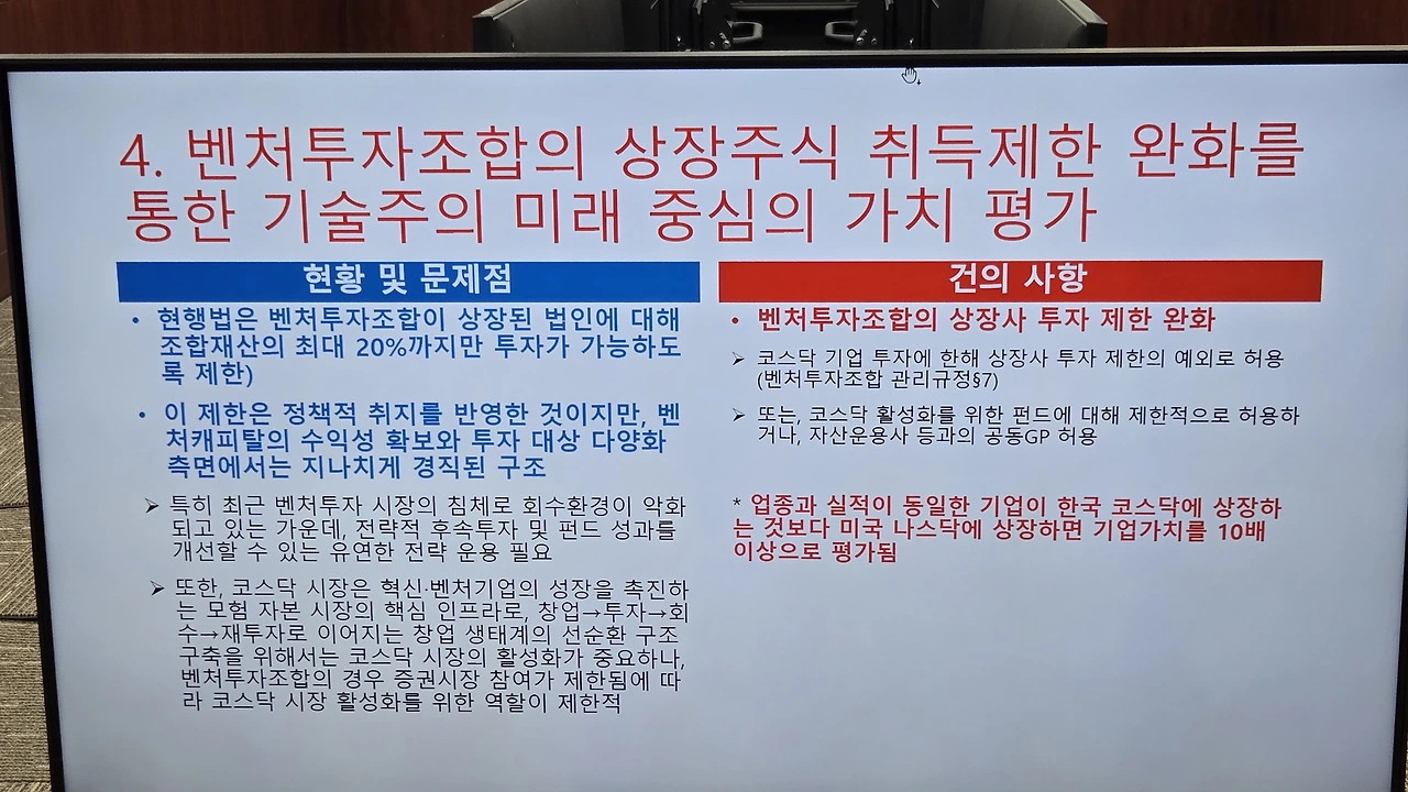 이정민 벤처기업협회 사무총장은 "기술기업 상장은 늘고 있지만 회수시장으로서의 기능은 여전히 제한적"이라며 "특례상장 제도의 유연화와 투자자 유인을 위한 세제 개선이 필요하다"고 말했다.