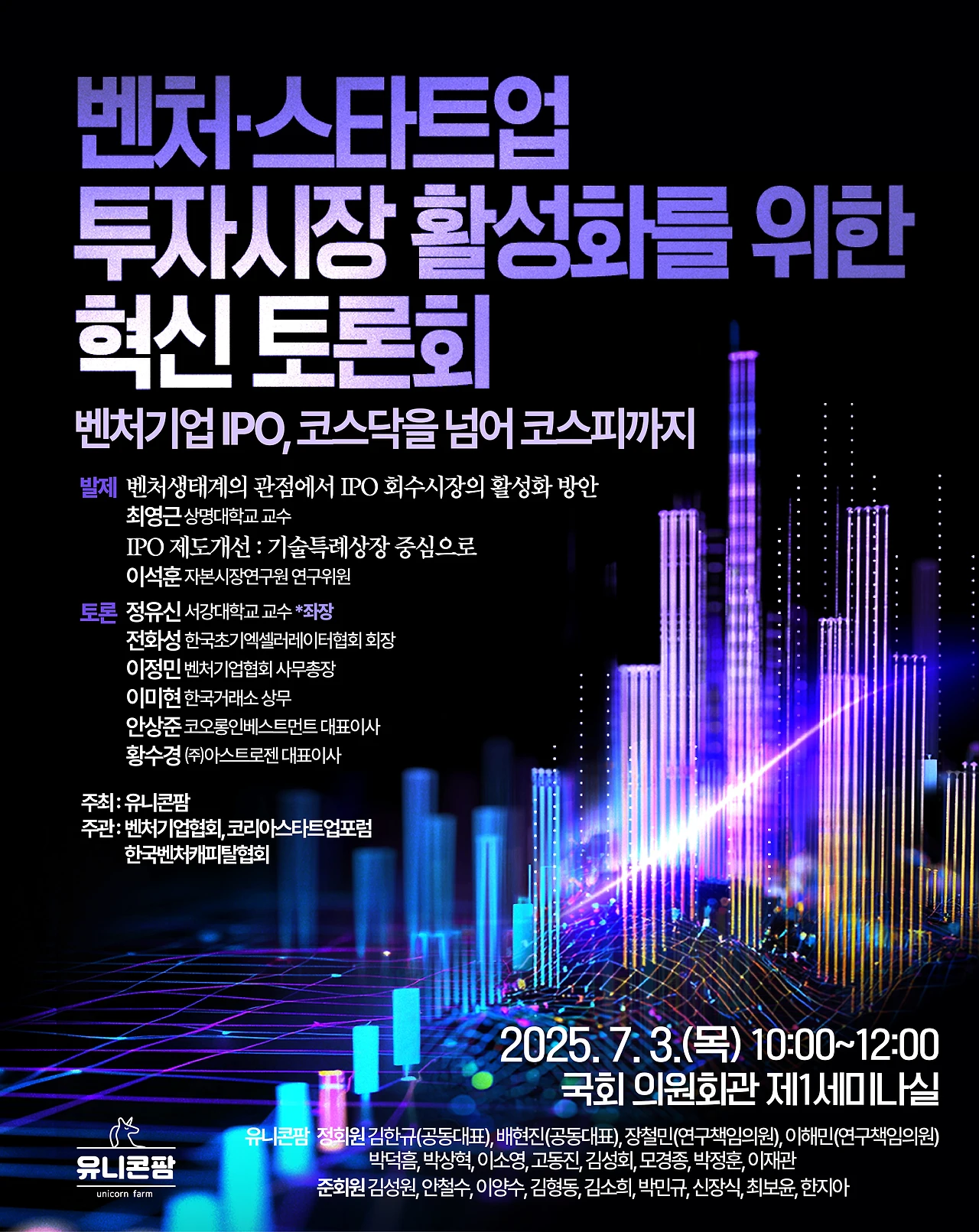 벤처기업협회는 국회 의원연구단체 유니콘팜과 함께 '벤처·스타트업 투자시장 활성화를 위한 혁신 토론회'를 국회 의원회관 제1세미나실에서 개최했다고 3일 밝혔다.