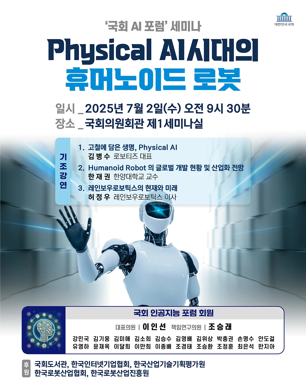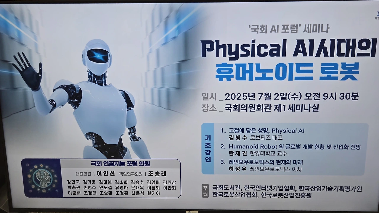 이번 세미나는 인공지능 기술이 디지털 영역을 넘어 물리적 현실과 결합하는 ‘Physical AI’ 시대의 흐름을 조망하고, 그 중심에 있는 휴머노이드 로봇 산업의 미래와 정책적 과제를 함께 논의하고자 마련됐다.
