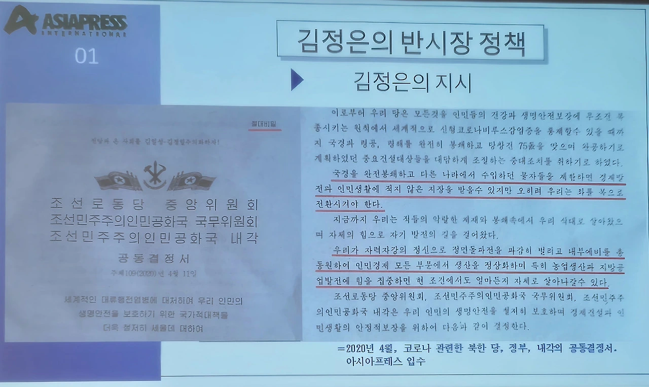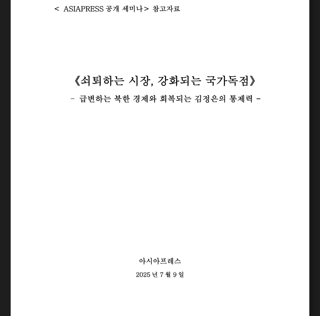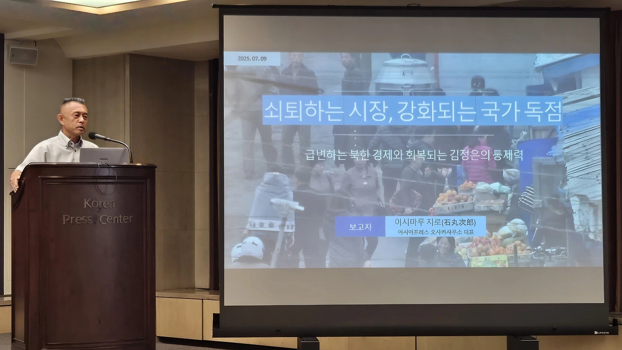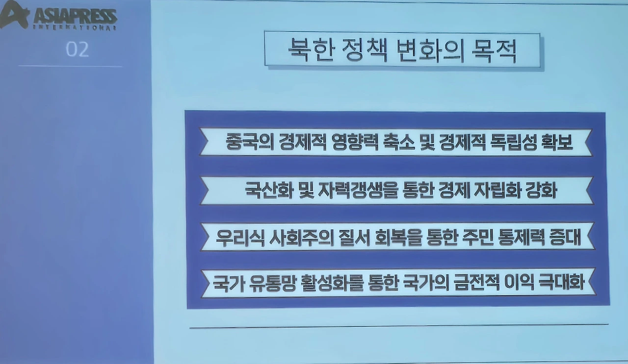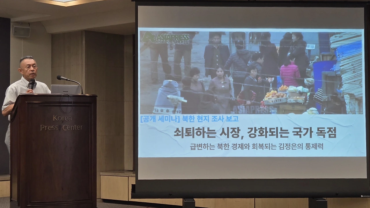 일본의 북한 전문매체 아시아프레스는 9일 북한 내부 협조자 6명의 현지 조사 결과를 바탕으로 '쇠퇴하는 시장, 강화되는 국가독점- 급변하는 북한 경제와 회복되는 김정은의 통제력'이라는 제목의 세미나를 개최했다.