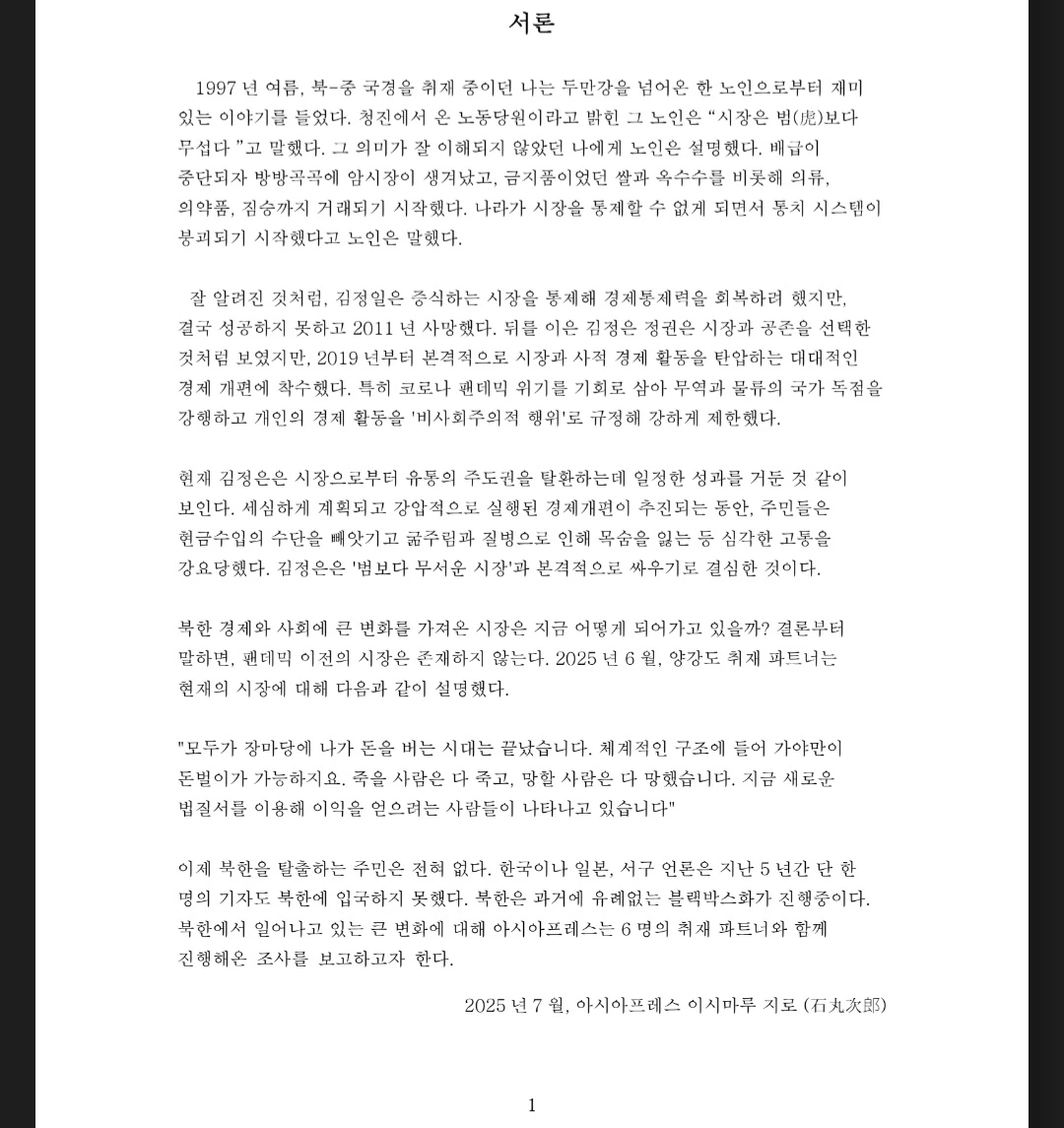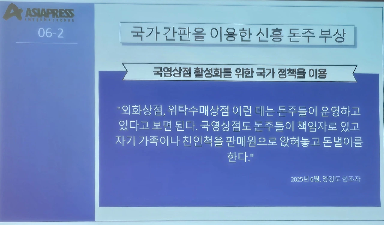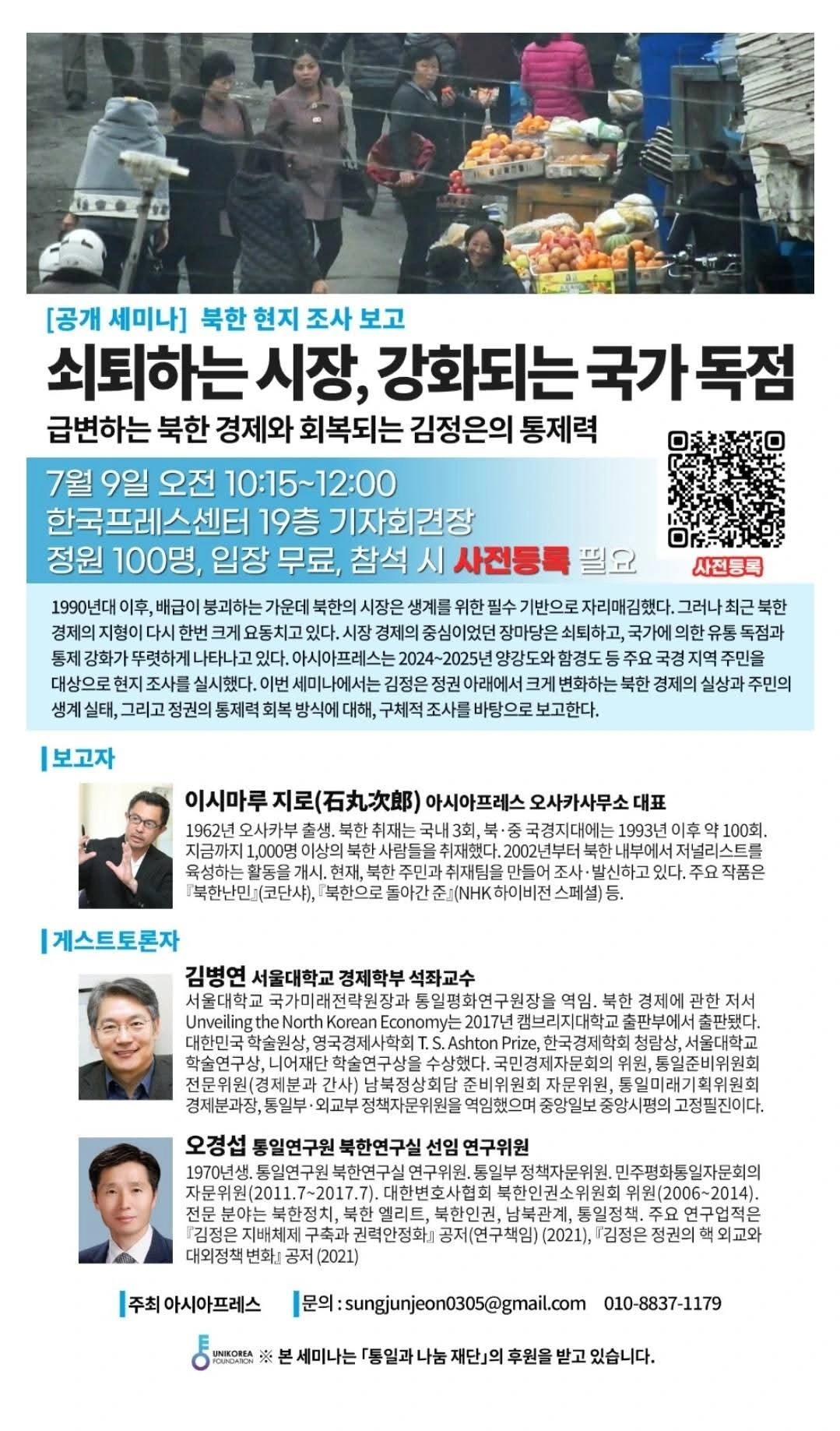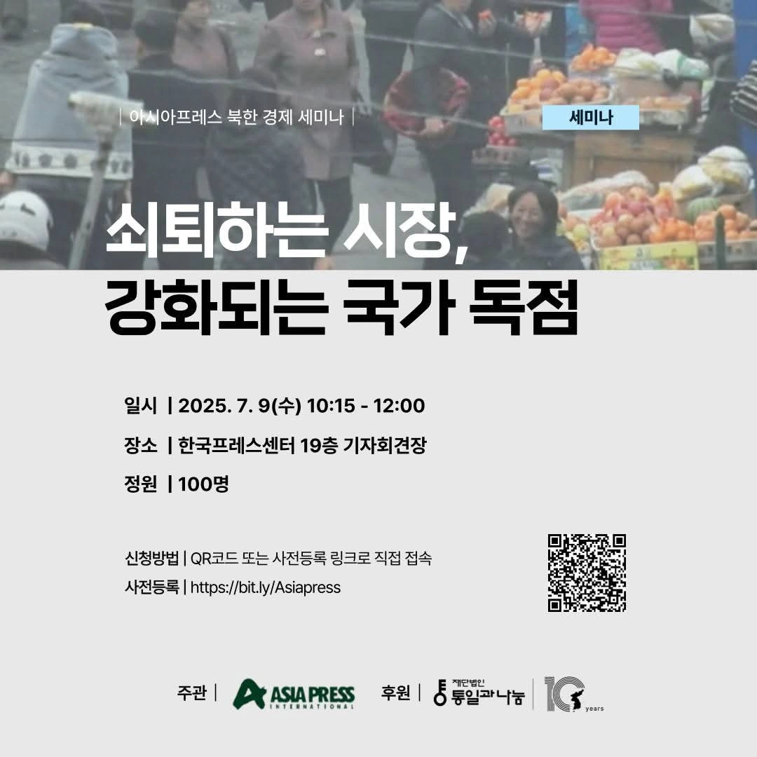 일본의 북한 전문매체 아시아프레스는 9일 북한 내부 협조자 6명의 현지 조사 결과를 바탕으로 '쇠퇴하는 시장, 강화되는 국가독점- 급변하는 북한 경제와 회복되는 김정은의 통제력'이라는 제목의 세미나를 개최했다.
