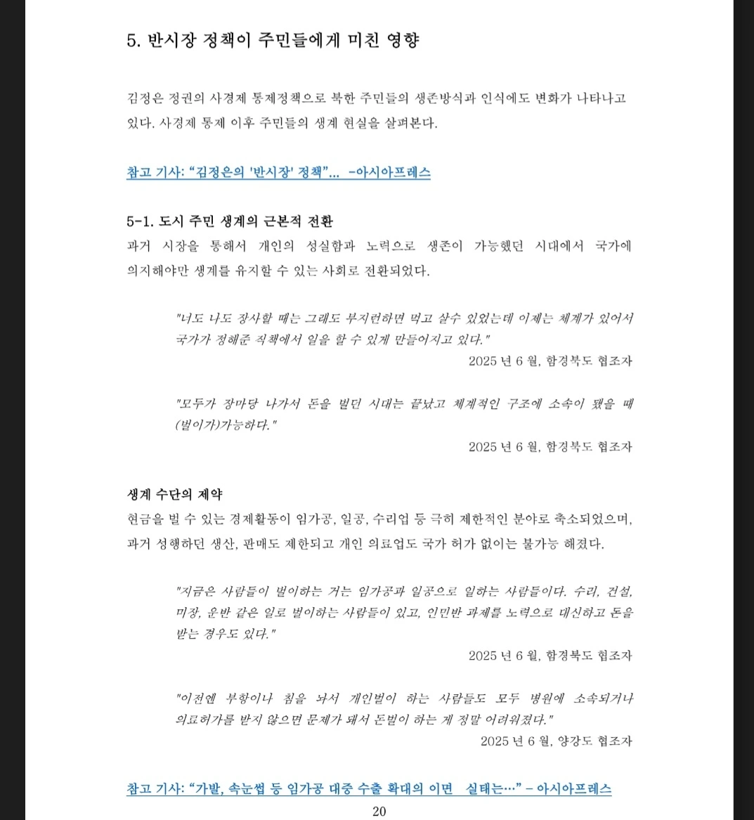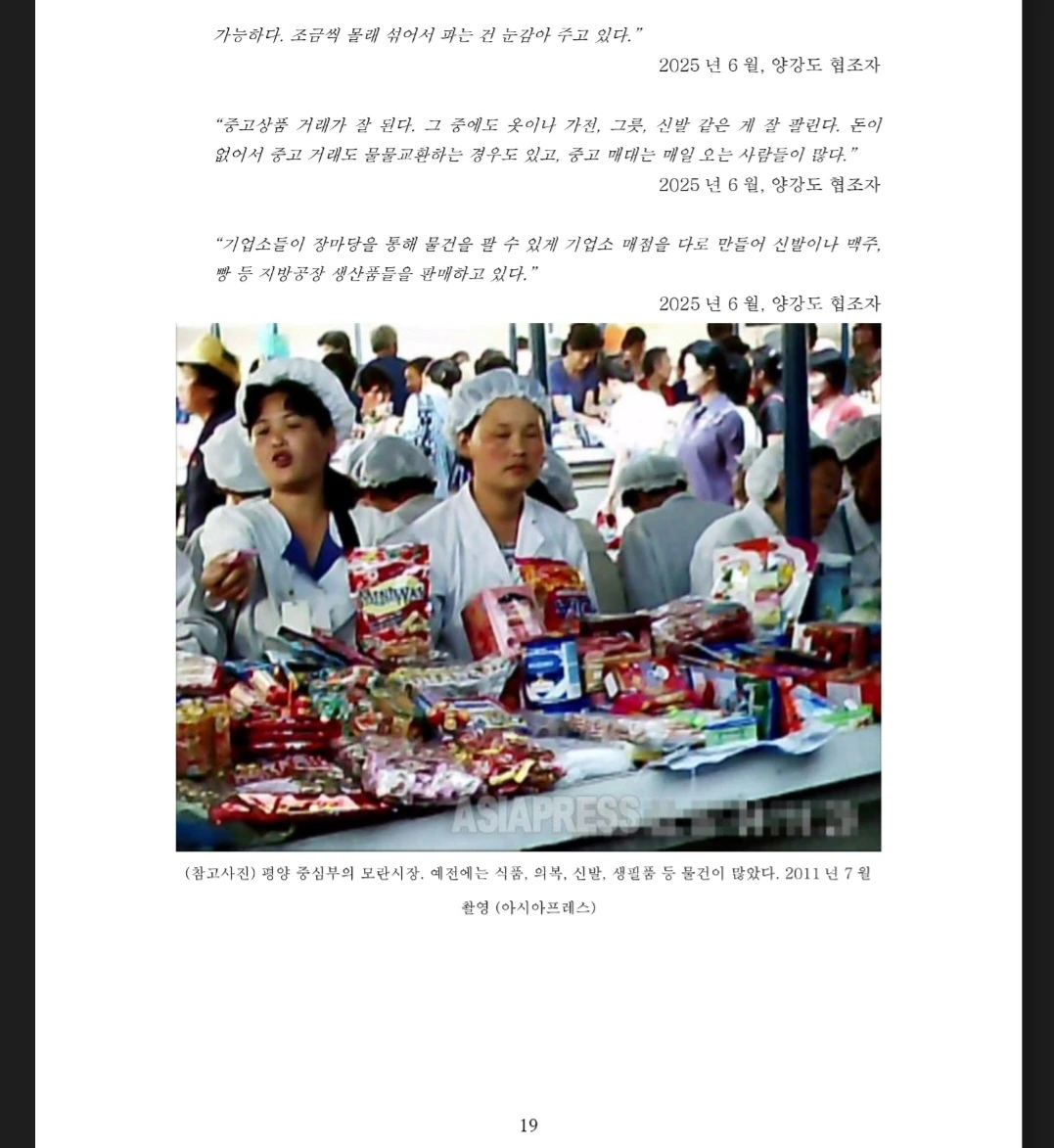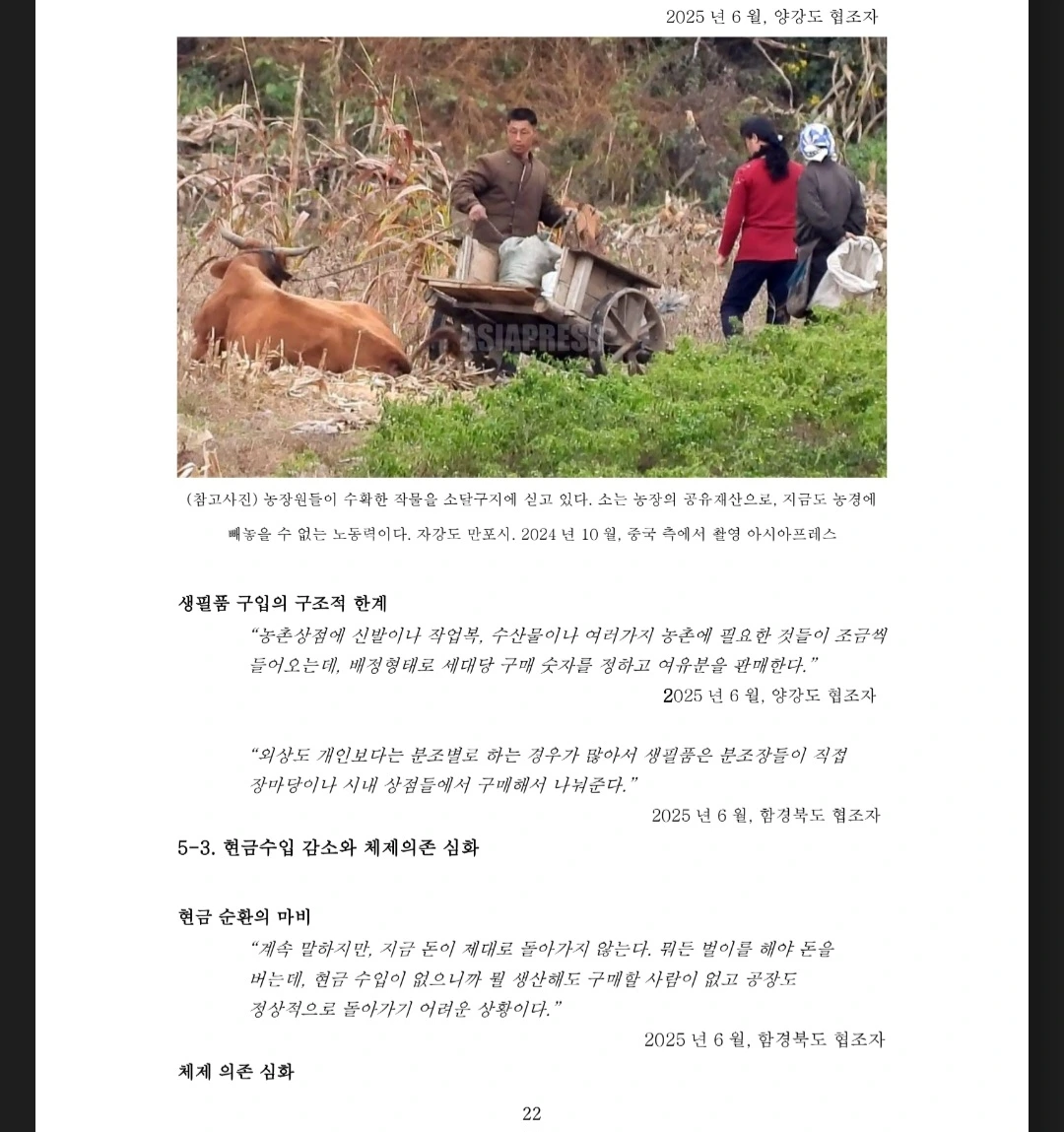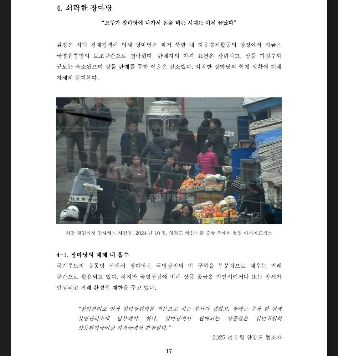 아시아프레스의 조사 결과에 따르면, 북한 주민들이 장마당에서 자유롭게 경제 활동을 하며 생계를 유지하던 시대는 끝났고, 국가가 허용한 조직과 직책에 소속되지 않으면 생계가 어려워지는 상황으로 바뀐 것으로 드러났다.