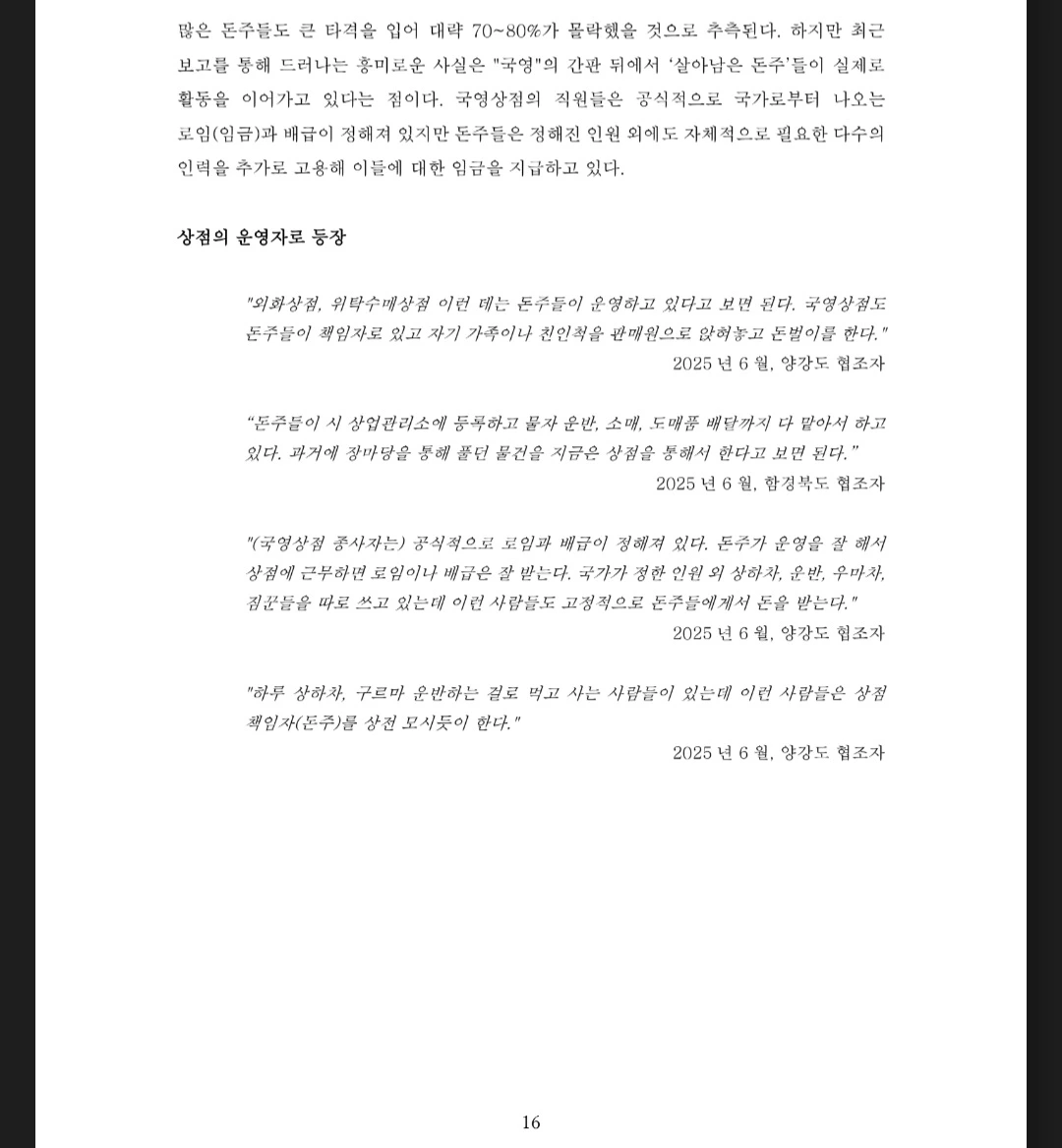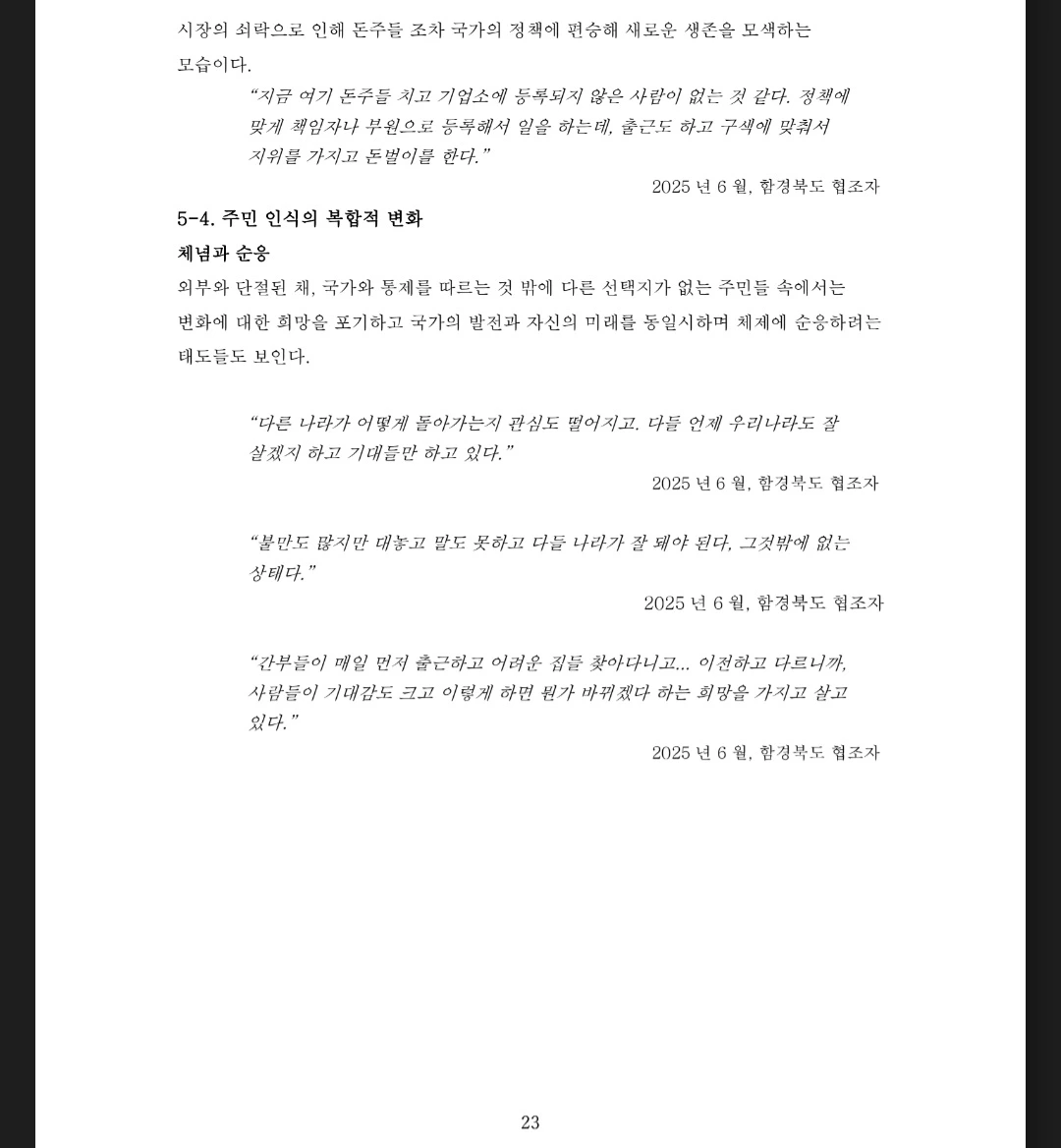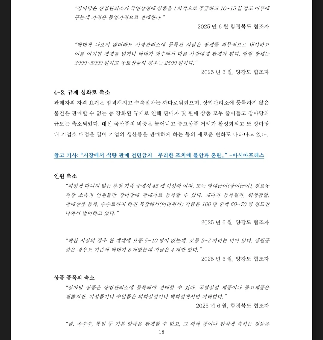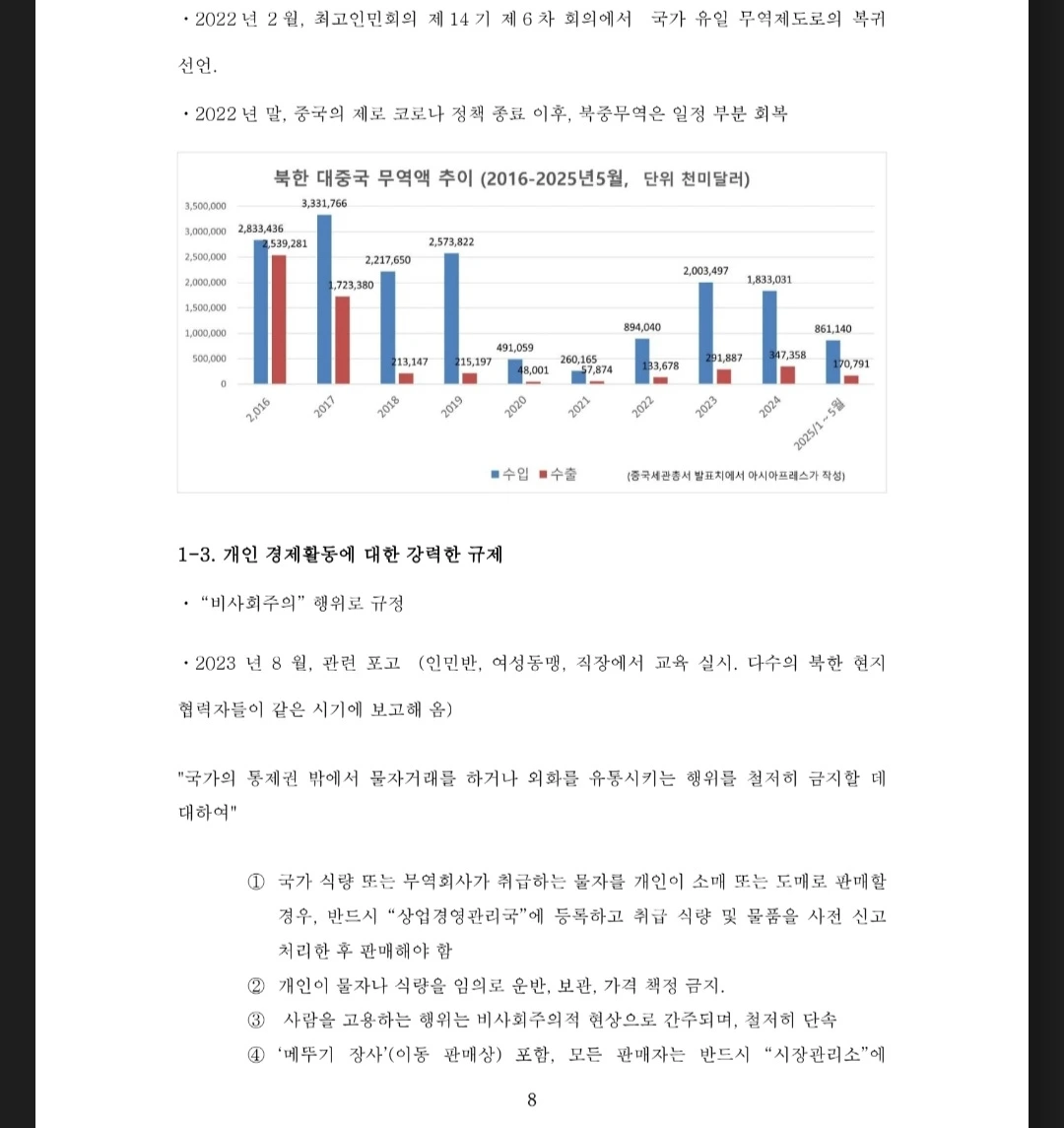 아시아프레스의 조사 결과에 따르면, 북한 주민들이 장마당에서 자유롭게 경제 활동을 하며 생계를 유지하던 시대는 끝났고, 국가가 허용한 조직과 직책에 소속되지 않으면 생계가 어려워지는 상황으로 바뀐 것으로 드러났다.