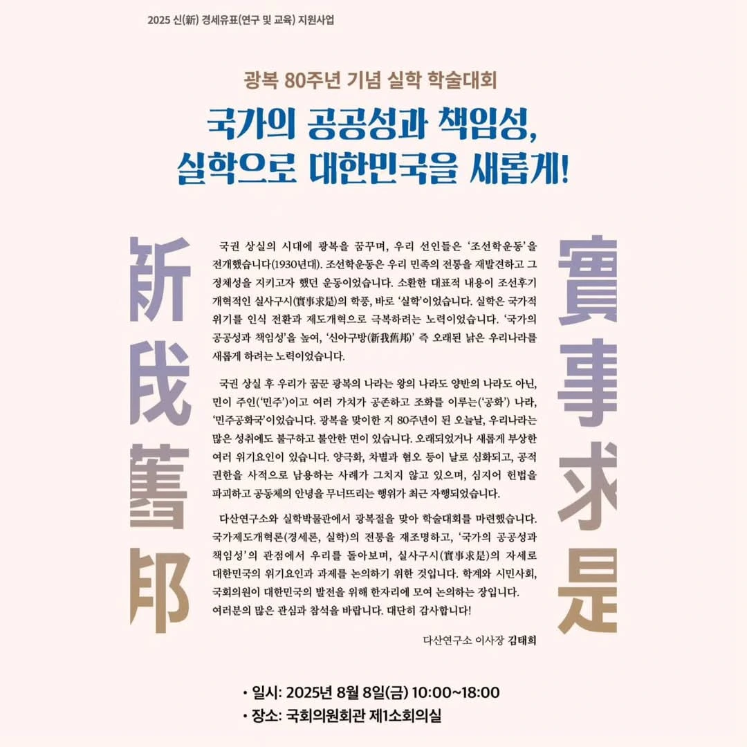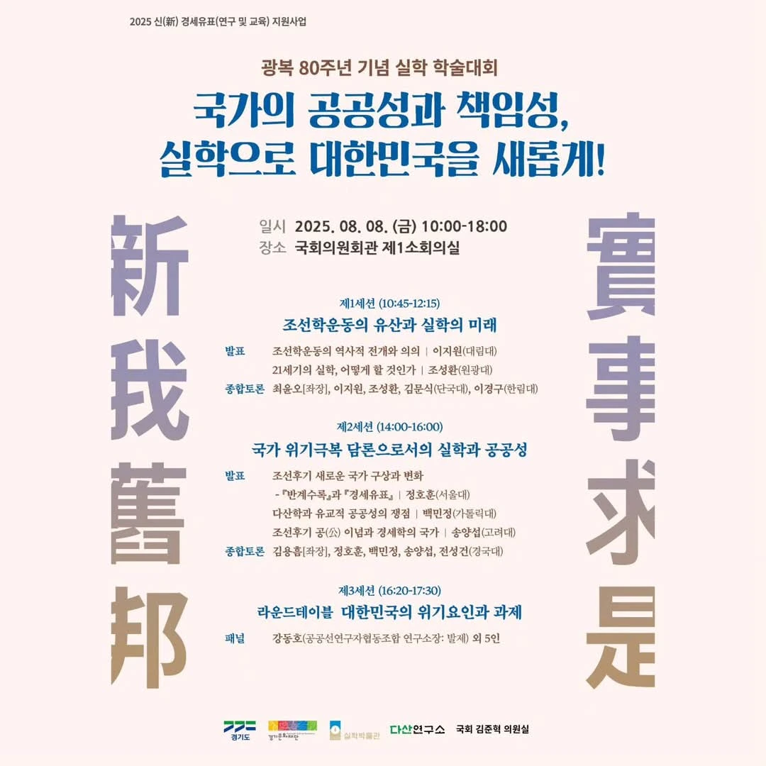 당시 지식인들은 실학이 지닌 실천적 성격과 제도 개혁의 사상을 통해 일제의 억압 속에서도 민족의 정체성과 공동체 가치를 지켜내고자 했다. 단순한 전통 회복을 넘어, 새로운 사회를 설계할 수 있는 철학적 자산으로 실학을 받아들인 것이다. 이러한 흐름은 오늘날 한국 사회가 안고 있는 여러 과제를 다시 생각해보는 데에도 도움을 준다.