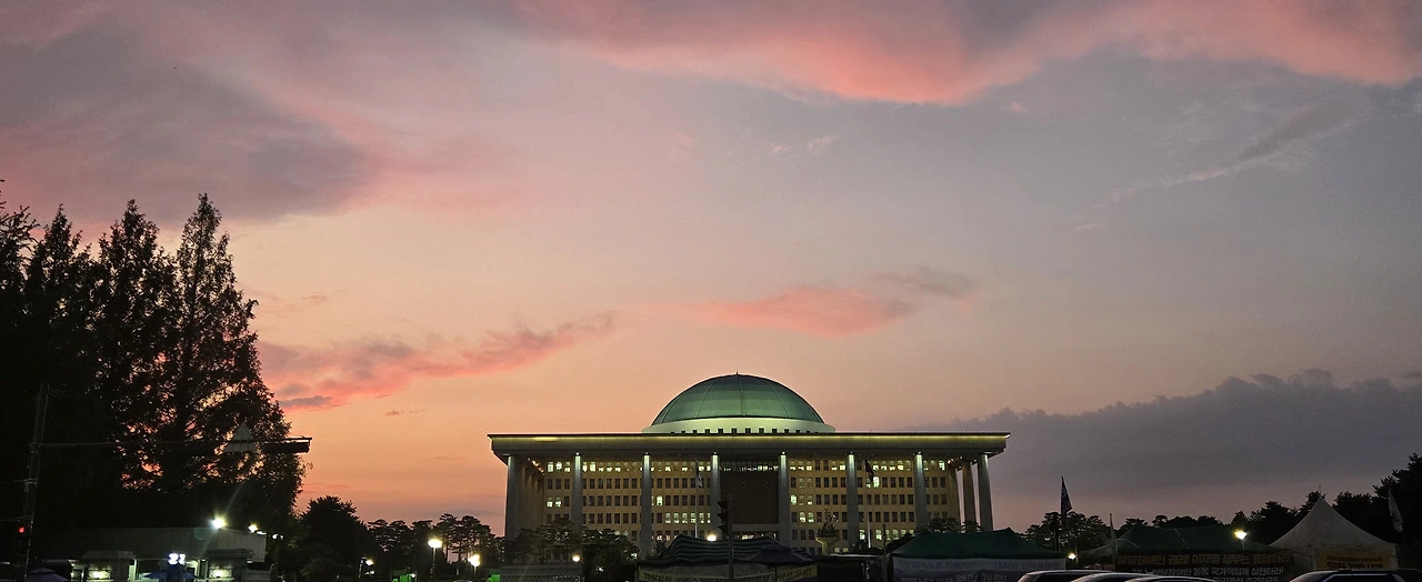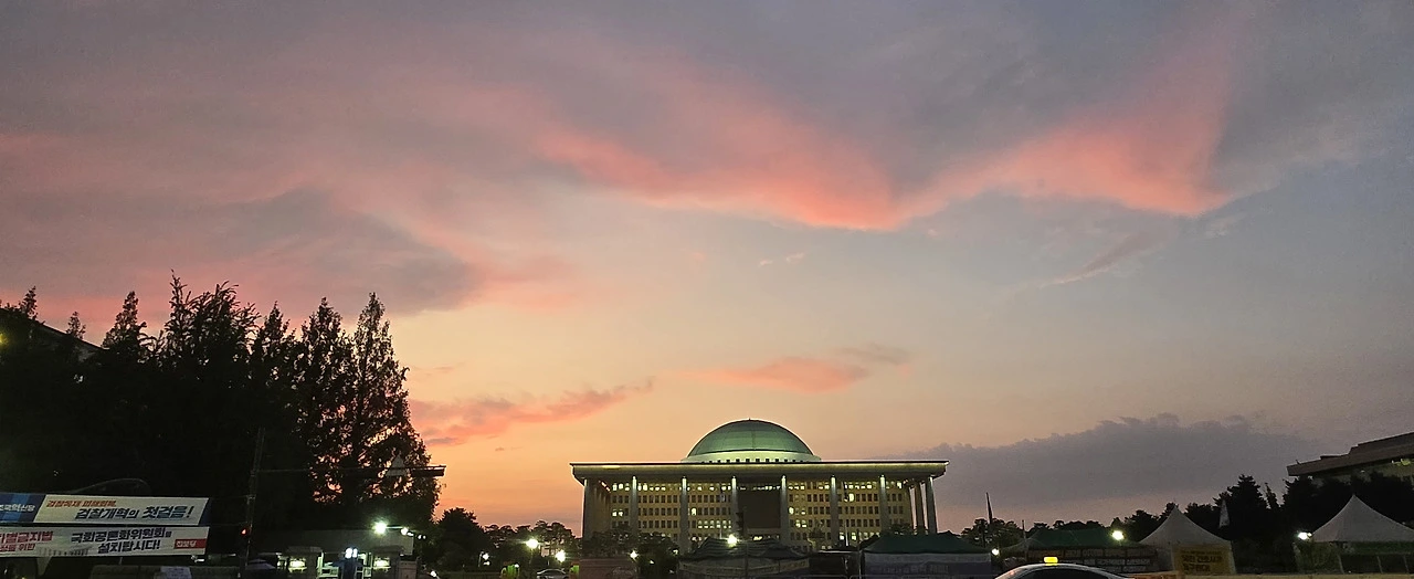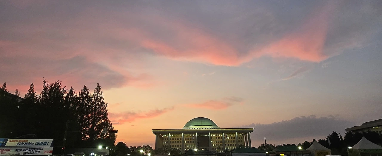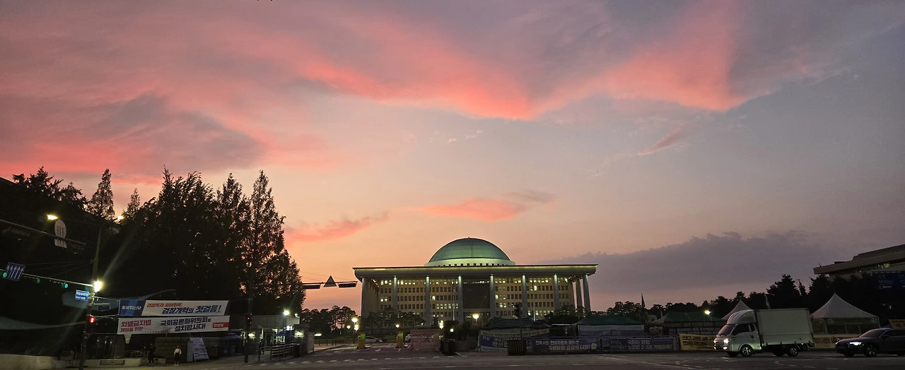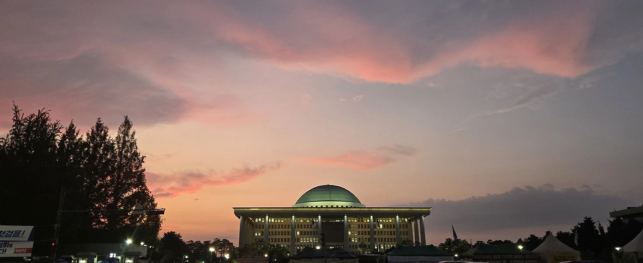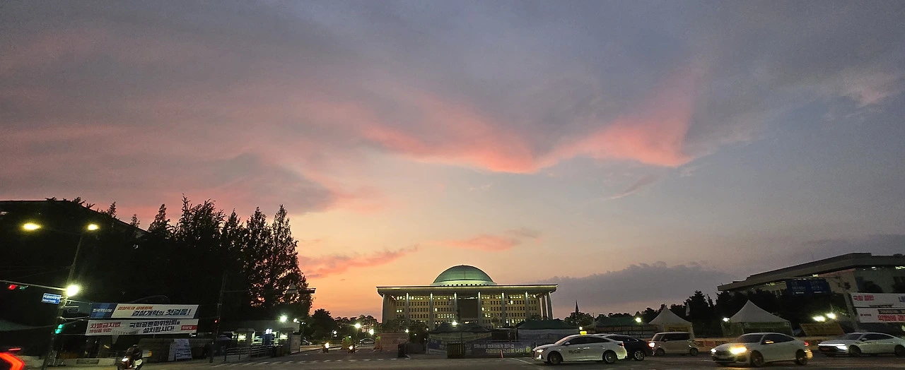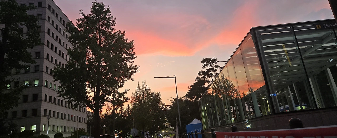 국회의사당 정문 앞 저녁노을이 신비로워...