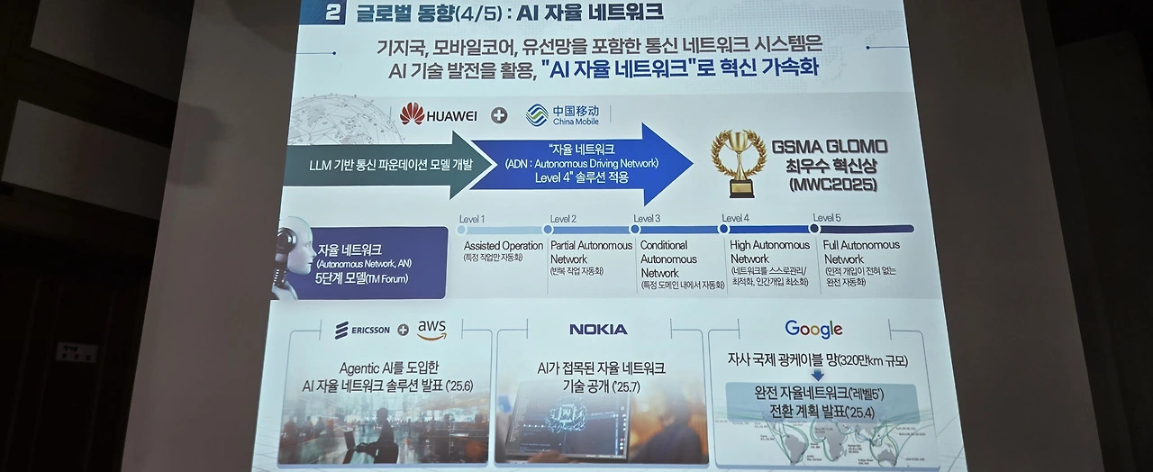 이날 현장에선 우리나라의 경우 글로벌 AI 패권 경쟁에서 밀린 감이 있다고 평가되는 가운데, ‘완전 자율 네트워크’ 구현 시 또 다른 기회를 모색할 수 있을 것이라 봤다.