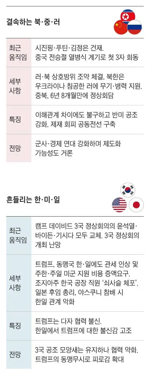 이런 상황일수록 우리 정부가 나서서 주도적으로 외교적 해법을 모색해야 한다는 목소리가 나온다. 김재천 서강대 교수는 “트럼프 대통령도 북·중·러 3국이 모인 중국의 전승절 행사를 보며 느낀 것이 있었을 것”이라며 “트럼프 2기 행정부에서 한·미·일 협력이 부진한데, 이럴 때 우리 정부가 3국 협력 체제를 견인하는 것이 중요하다”고 했다. 최강 아산정책연구원장도 “북·중·러의 결속은 오히려 한·미·일이 긴밀히 협력해야 할 근거를 보여준다”며 “이재명 대통령이 10월 아시아태평양경제협력체(APEC) 회의 등을 계기로 제2의 캠프 데이비드 회동을 성사시킨다면 큰 외교적 성과가 될 수 있을 것”이라고 했다.