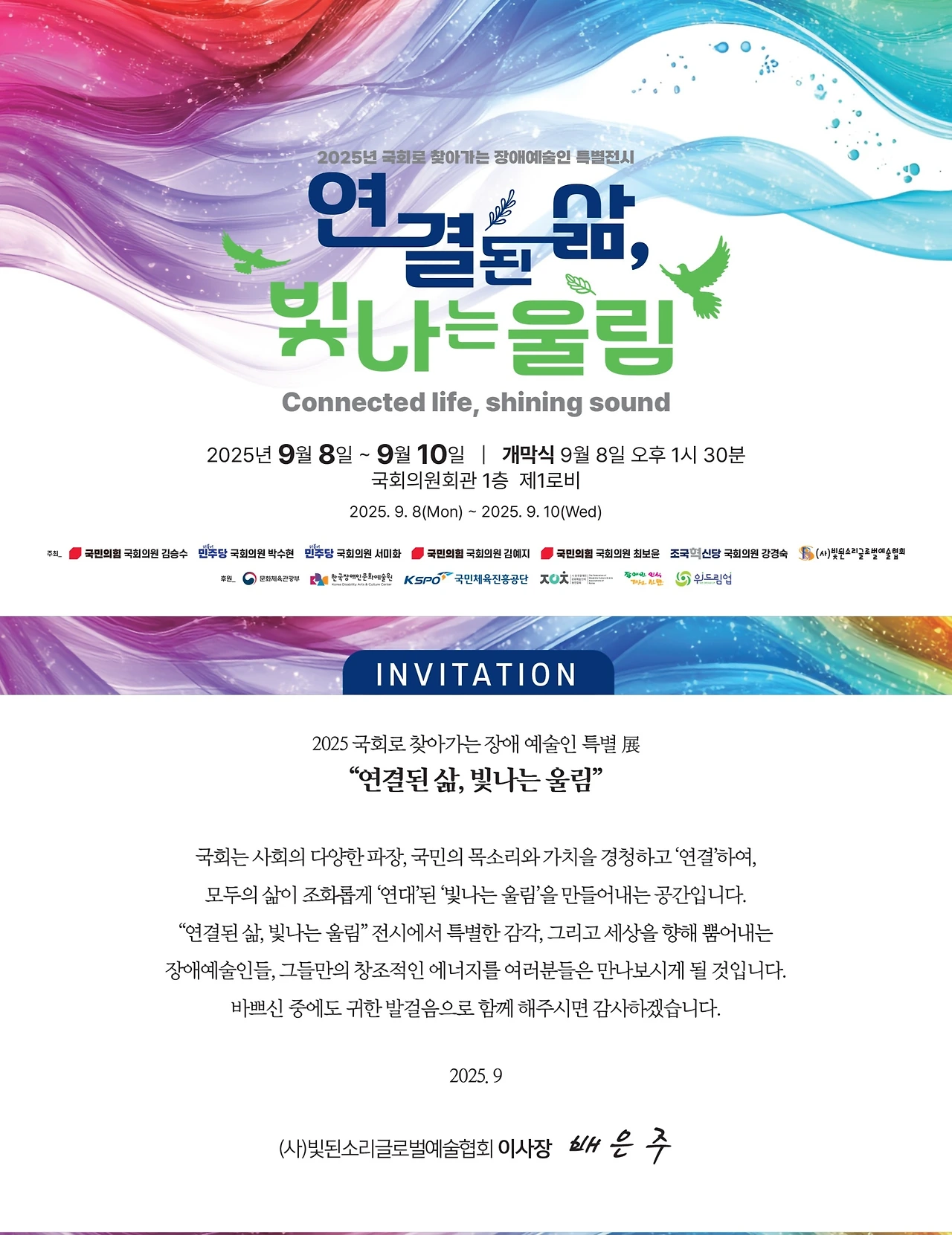 주최 : 국민의힘 김승수 국회의원, 더불어민주당 박수현 국회의원, 더불어민주당 서미화 국회의원, 국민의힘 김예지 국회의원, 국민의힘 최보윤 국회의원, 조국혁신당 강경숙 국회의원, 빛된소리글로벌예술협회