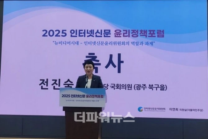 전진숙 더불어민주당 의원은 “온라인을 통해 쏟아지는 수많은 정보 속에는 왜곡된 사실과 가짜뉴스가 적지 않아 정치인으로서 피해를 체감할 때가 많다”며 “언론이 가져야 할 기본 윤리와 책임은 시대가 변해도 결코 가벼워질 수 없다”고 말했다. 그는 “인터넷신문윤리위원회는 그간 허위 보도와 선정적 광고, 청소년 보호 등에서 중요한 역할을 해왔다”며 “AI와 딥페이크, 개인정보 유출 같은 새로운 위협 속에서 이번 포럼은 강화된 윤리 기준을 모색하는 뜻깊은 자리”라고 평가했다. 이어 “국회에서도 제도적 뒷받침을 아끼지 않겠다”고 밝혔다.