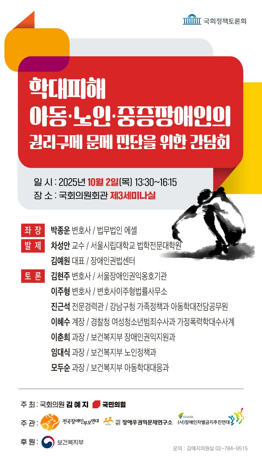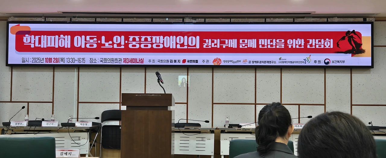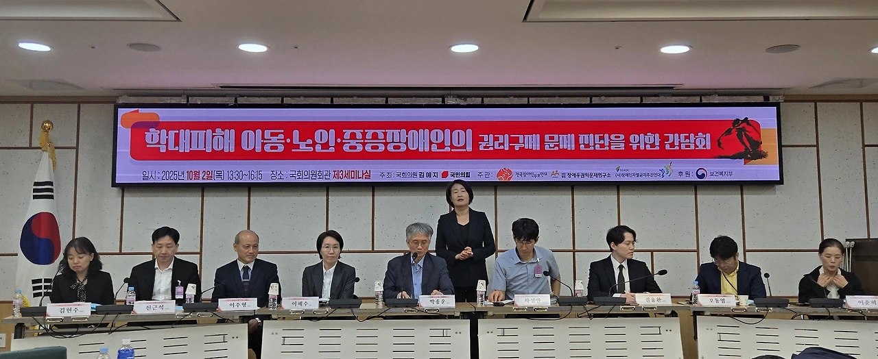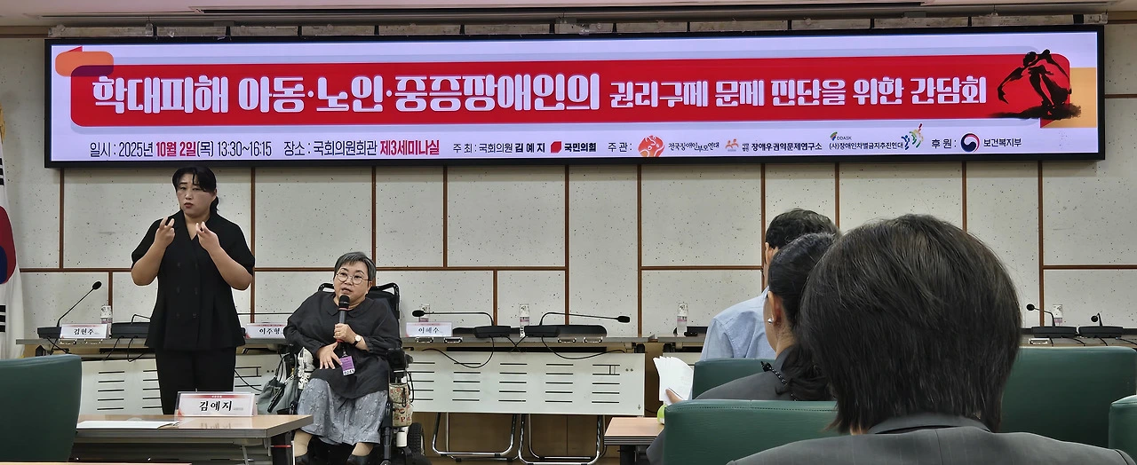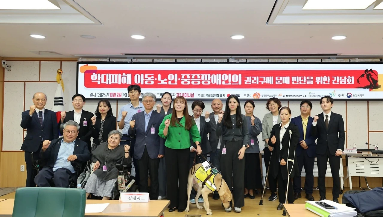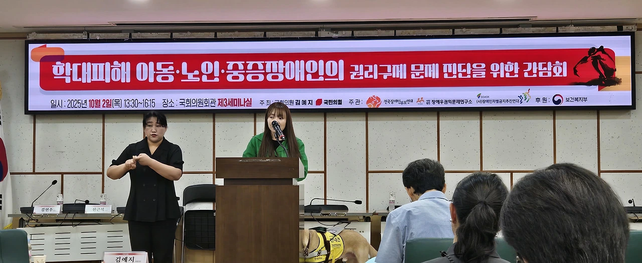 국회 보건복지위원회 김예지 의원(국민의힘)은 2일 국회의원회관에서 ‘학대피해 아동·노인·중증장애인의 권리구제 문제 진단을 위한 간담회’를 개최했다.