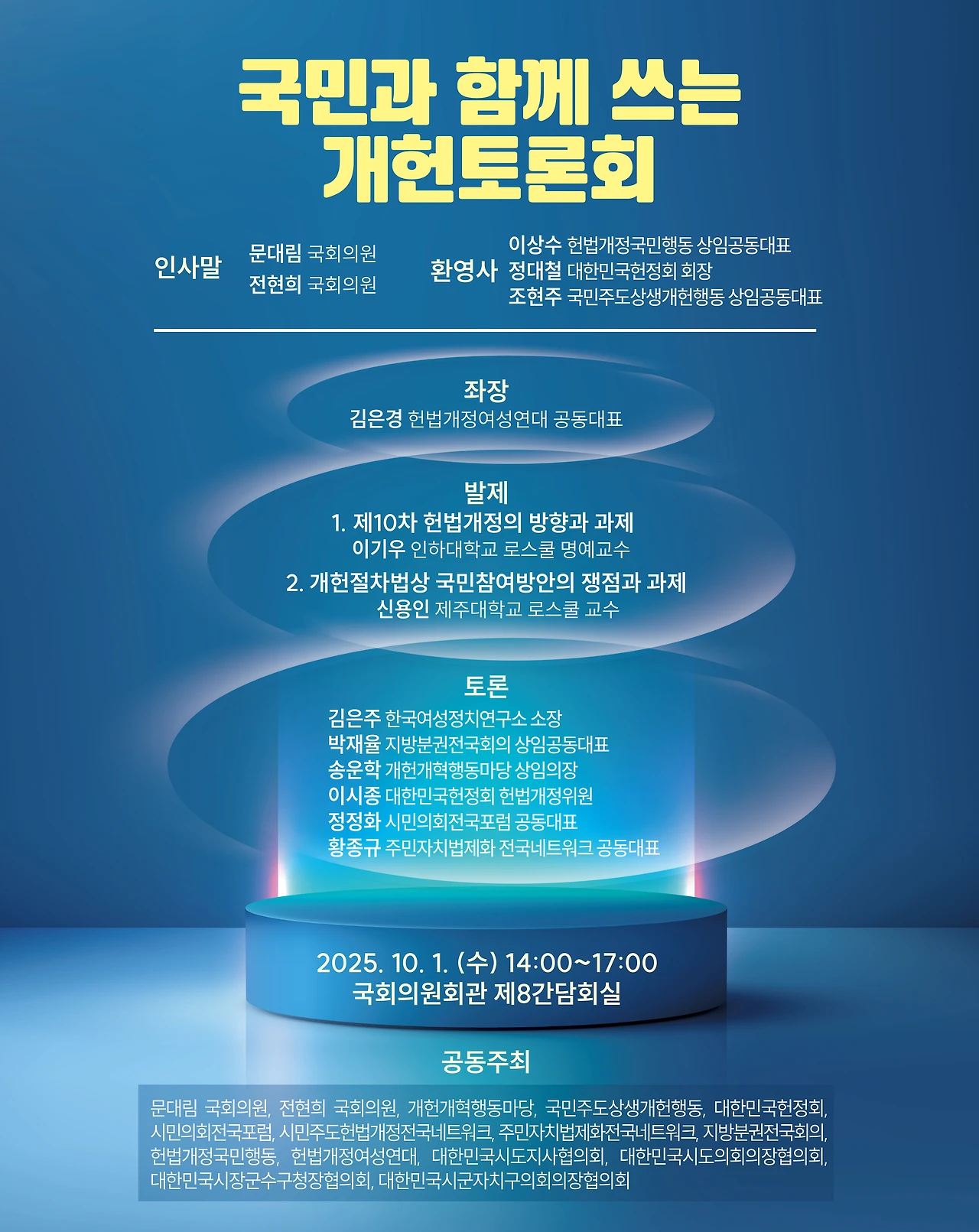 주최 : 문대림 국회의원, 대한민국헌정회, 대한민국시도지사협의회, 대한민국시도의회의장협의회, 대한민국시장군수구청장협의회, 대한민국시군자치구의회의장협의회, 국민주도상생개헌행동, 지방분권전국회의, 헌법개정국민행동