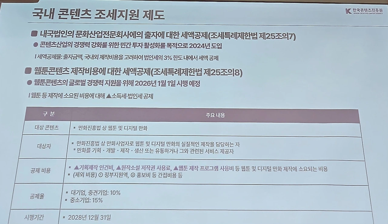 최 장관은 “제작비 부담을 경감하고 적극적인 투자가 이뤄지는 환경을 조성해야한다”라며 “정부 차원의 세제지원이 절실하고 기존 영상에 더해 웹툰도 우선 내년부터 적용하기로 했다. 음악과 게임에도 이런 노력이 추진되어야 한다”라고 화답했다.