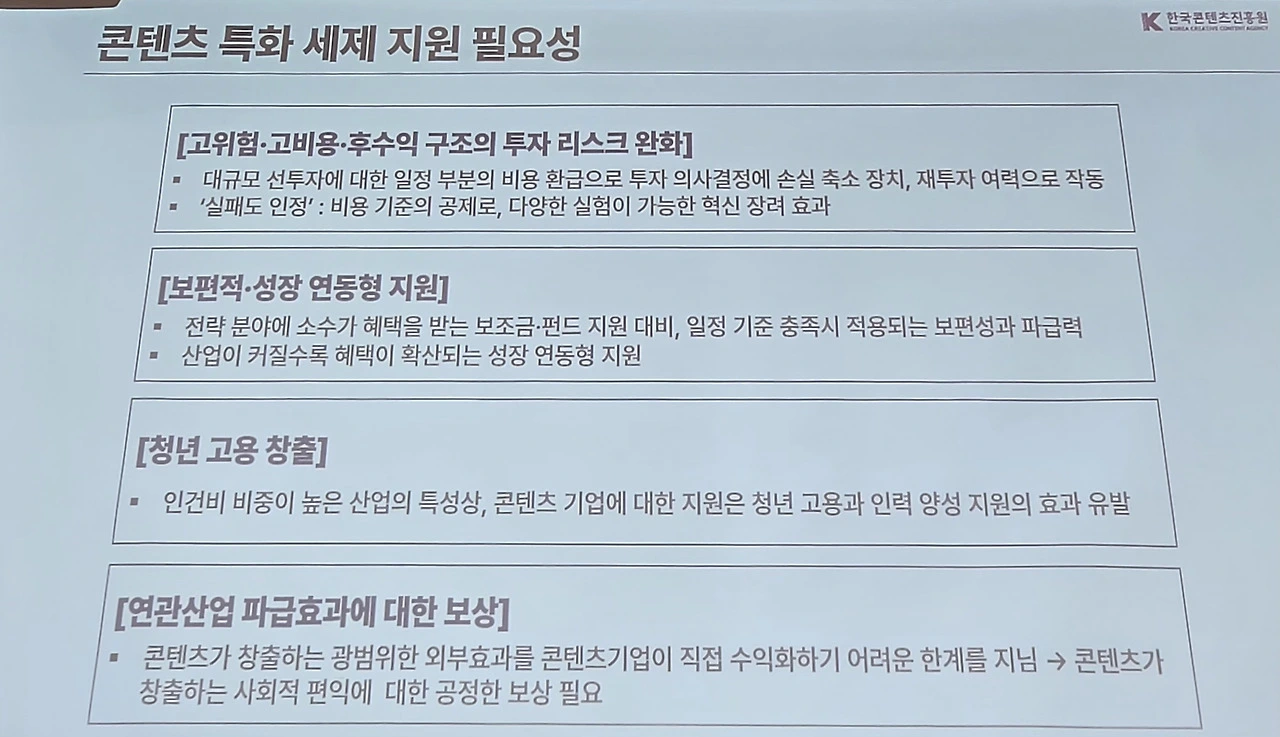 채종성 팀장은 “콘텐츠 분야는 성공 불확실성이 크고 하나의 성공을 위해서는 수많은 실패가 존재하기 마련이다”라며 “하나의 성공이 이뤄지면 이에 대한 수혜는 모두가 누리고 세액공제가 또 다른 성공을 위한 재투자로 이어지는 만큼 정부의 지원이 필요하다”라고 강조했다.