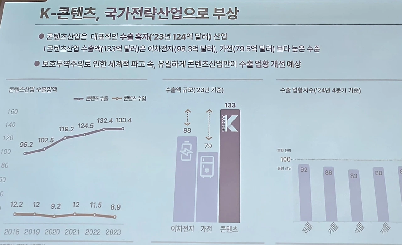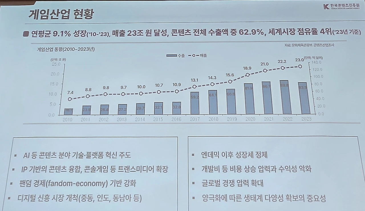 최휘영 문화체육관광부 장관은 "우리나라는 게임 강국이지만, 지난해 성장이 멈췄고 중국 같은 타 국가와의 경쟁도 녹록치 않은 상황"이라며 "K팝으로 대표되는 음악시장도 빌보드 차트 정상에 오르며 전 세계적으로 인기를 높이고 있지만, 화려함 이면에 다양한 위기의식이 있다"고 설명했다.