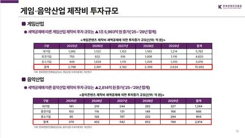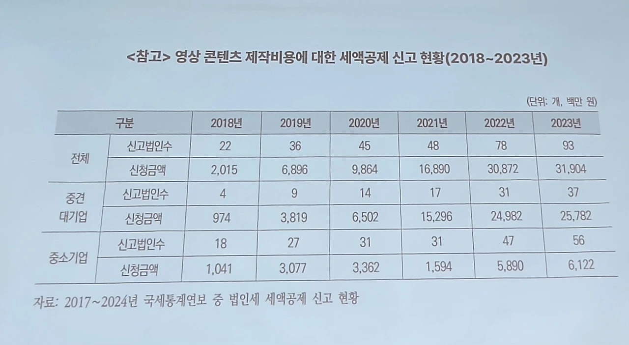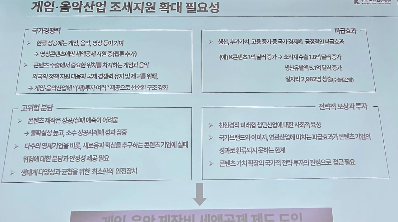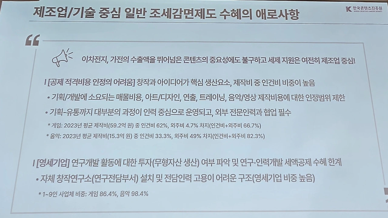 현재 영상 콘텐츠의 경우 제작비의 일정 금액에 대해 세액공제 혜택을 받고 있고 내년부터 웹툰 분야에도 적용 예정이지만 게임과 음악은 그렇지 못한 상황이다. 게임의 경우 2023년 콘텐츠 수출액의 62.9%를 차지할 정도로 주요한 비중을 차지하고 있고 K-팝 역시 K-콘텐츠의 위상을 알리는 첨병역할을 하고 있으나 역차별을 받고 있는 셈이다.
