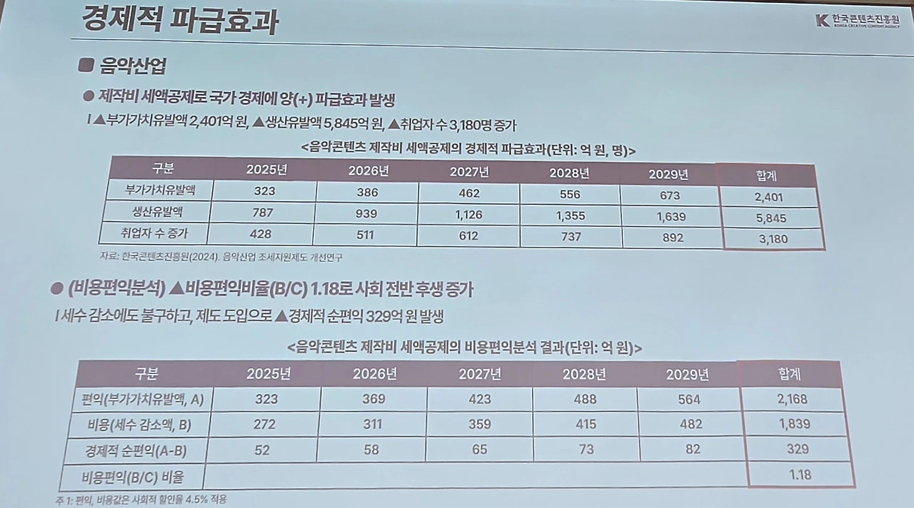K-콘텐츠 중 수출 비중이 높고 글로벌 영향력이 큰 게임과 음악도 영상과 웹툰처럼 제작비 세액공제가 필요하다는 의견이 나왔다. 제작비 세액 공제 지원을 통해 향후 5년간 게임 및 음악 분야 제작비 투자 규모가 약 1조8807억원(게임 1조5993억원, 음악 2814억원) 증가하고 이에 따른 비용편익도 크다는 설명이다. 부가가치유발액 1조6955억원(게임 1조4554억원, 음악 2401억원), 생산유발액 2조8395억원(게임 2조2550억원, 음악 5845억원), 취업자수 1만8693명(게임 1만5513명, 음악 3180명) 등 세액공제에 따른 세수 감소 대비 사회 전반의 후생이 증가할 것이라는 분석이다.