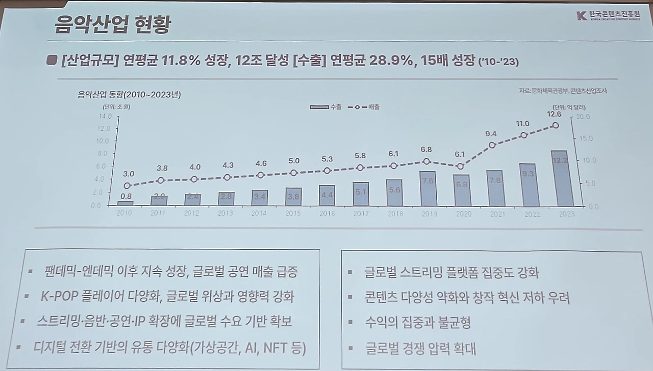 특히 최근 글로벌 경쟁 압력이 강화되며 게임산업은 정체되고 있고 음악 산업 역시 보다 탄탄한 성장 구조 확립을 위해 지원이 필요하다는 의견이 나오고 있다.