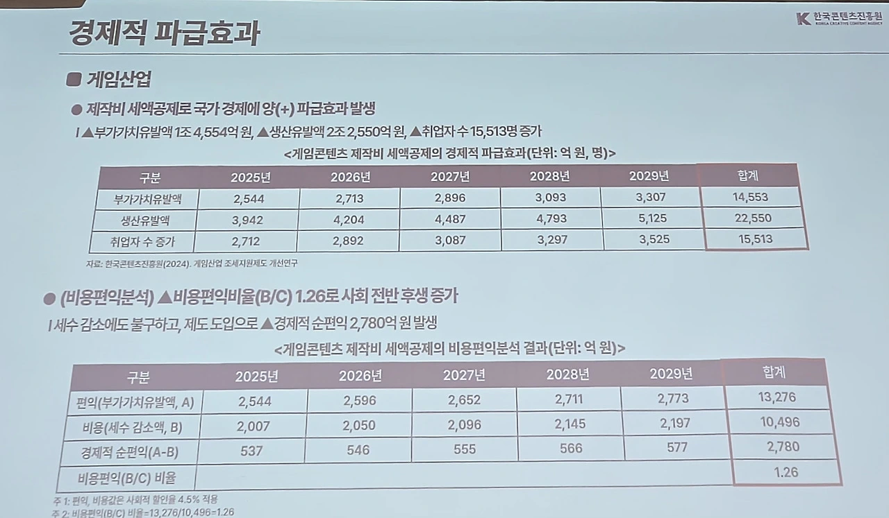이어 “지난해 게임과 음악 분야 조세 지원 제도 개선에 따른 파급효과 분석을 진행한 결과 영상과 동일한 기준으로 적용했을 시 게임은 향후 5년간 1조5000억원의 제작비 추가 투자, 음악은 약 2800억원 가량 투자가 날 것으로 예측됐고 비용편익 분석 시에도 편익이 더 클 것으로 나타났다”라고 강조했다.
