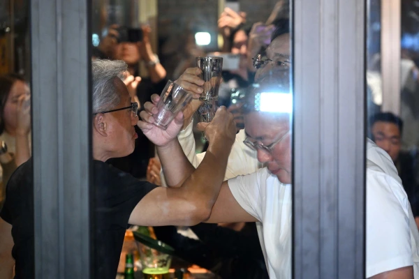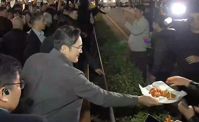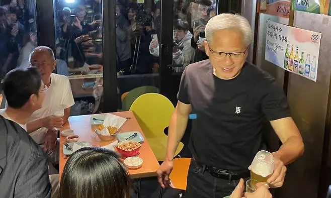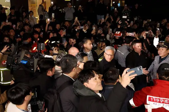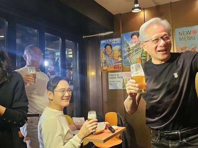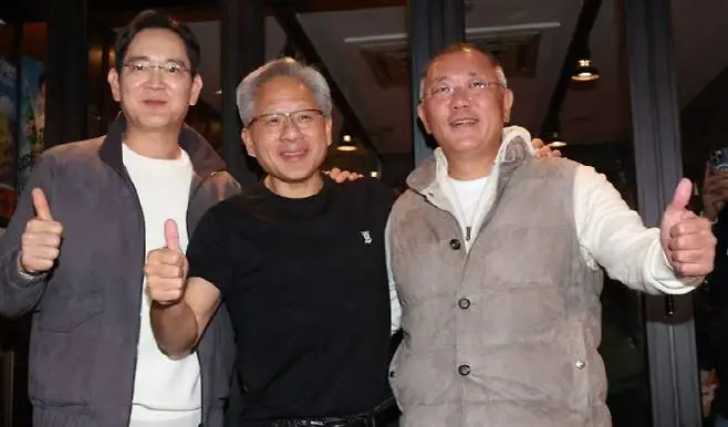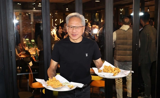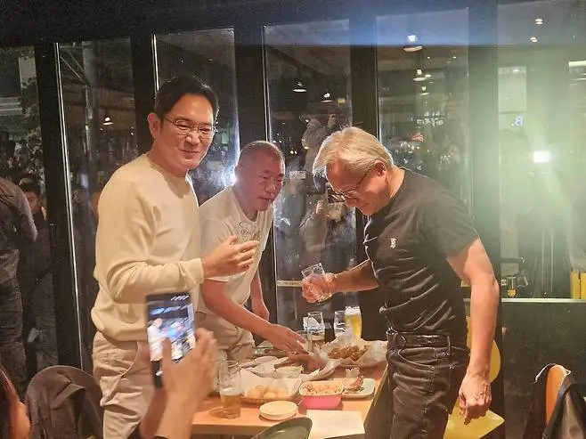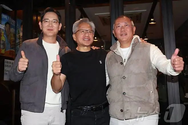 젠슨 황 엔비디아 최고경영자(CEO)와 이재용 삼성전자 회장, 정의선 현대자동차그룹 회장 간 '치맥 회동'이 약 한 시간 만에 마무리됐다. 황 CEO는 "아이 러브 유, 젠슨 황"이란 시민들의 환호성을 들으면서 회동 장소로 들어섰다.
