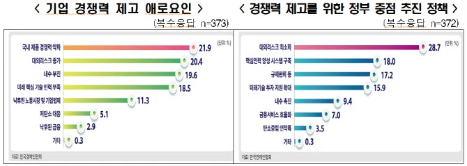 기업들은 그 원인을 두고 국내 제품 경쟁력 약화(21.9%)와 대외 리스크 증가(20.4%)를 첫손에 꼽았다. 아울러 인구 감축 등에 따른 내수 부진(19.6%), 인공지능(AI) 등 핵심 기술 인력 부족(18.5%), 경쟁국 대비 낙후한 노동시장 및 기업 법제(11.3%) 등을 지적했다. 정부 지원 과제로는 대외 리스크 최소화(28.7%), 핵심 인력 양성 시스템 구축(18.0%), 규제 완화·노동유연화(17.2%), 미래 기술 투자 지원 확대(15.9%) 등을 요청했다.