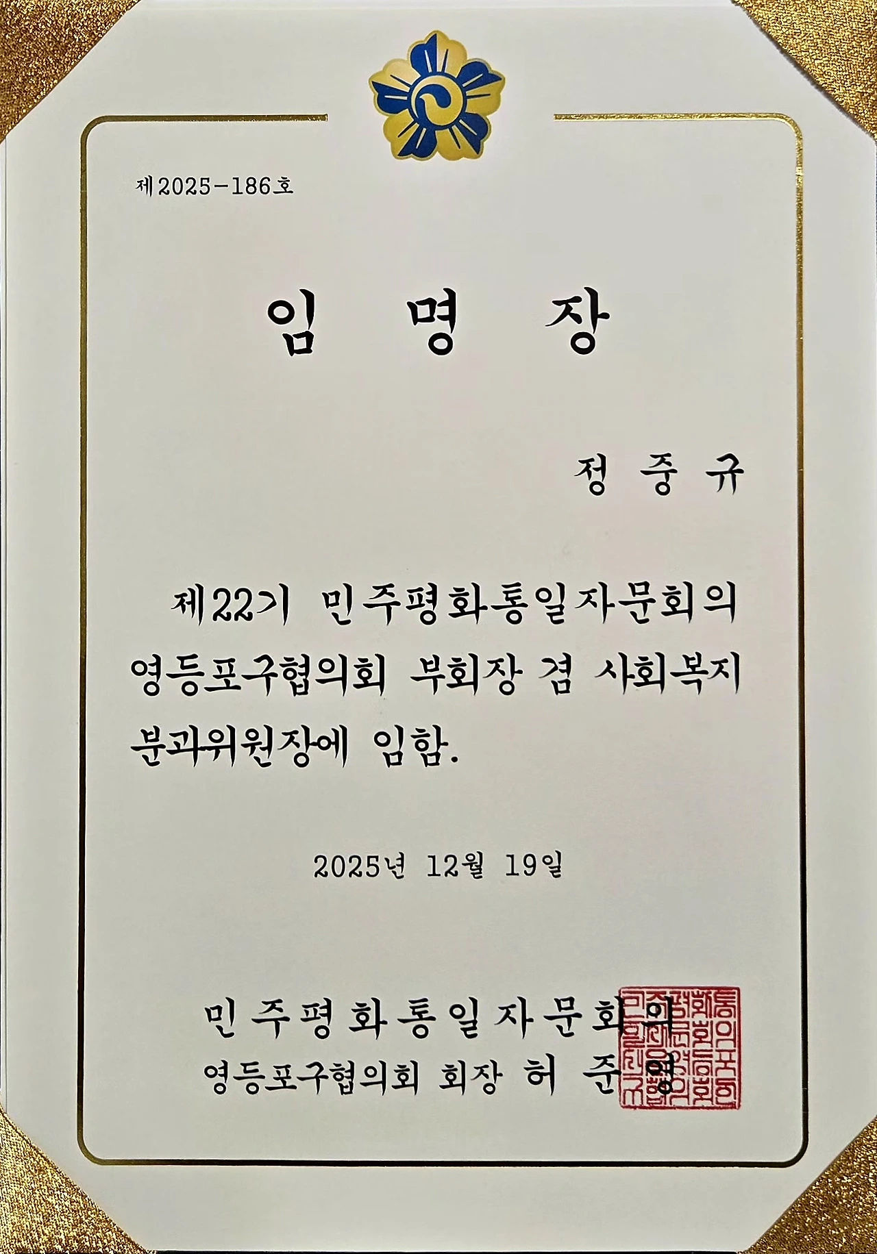- 민주평화통일자문회의 영등포구협의회 부회장 겸 사회복지분과위원장으로 두번째 임기를 시작하게 되었습니다.
