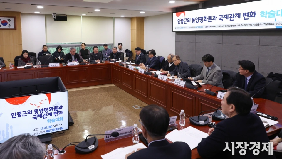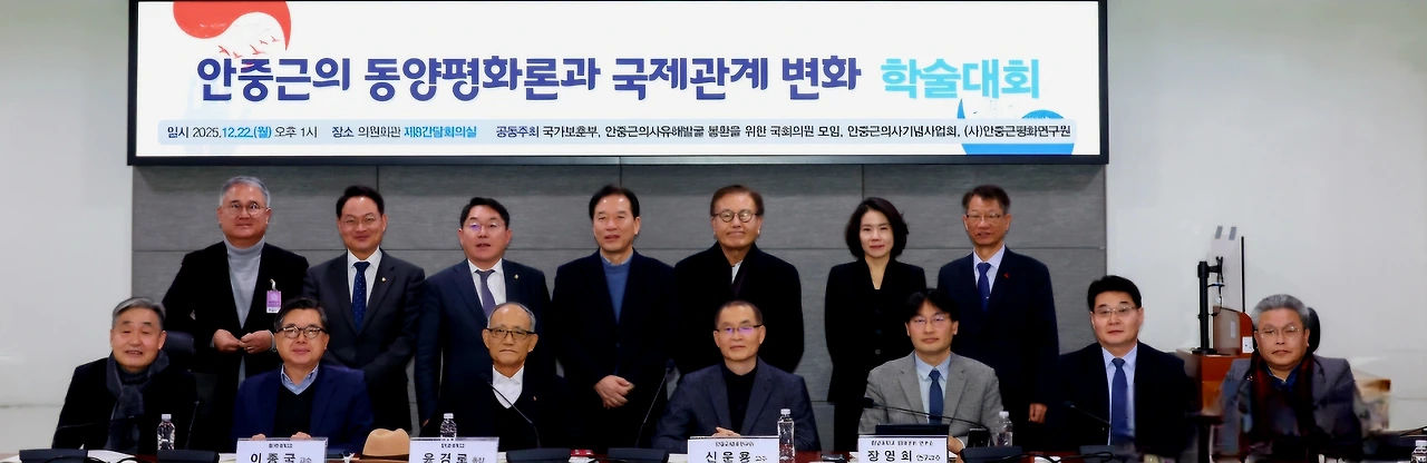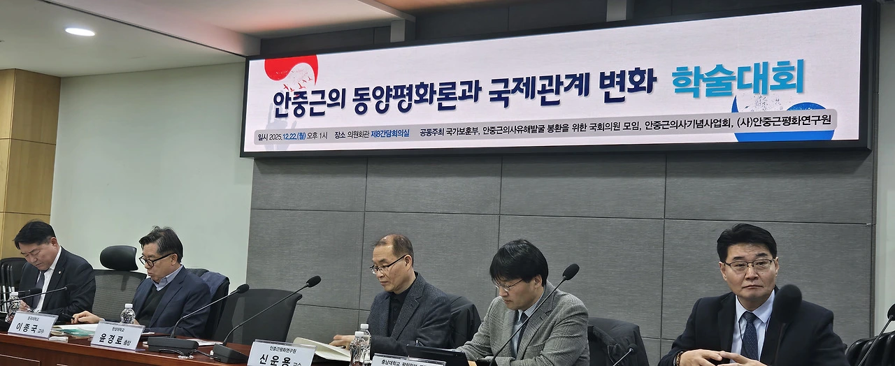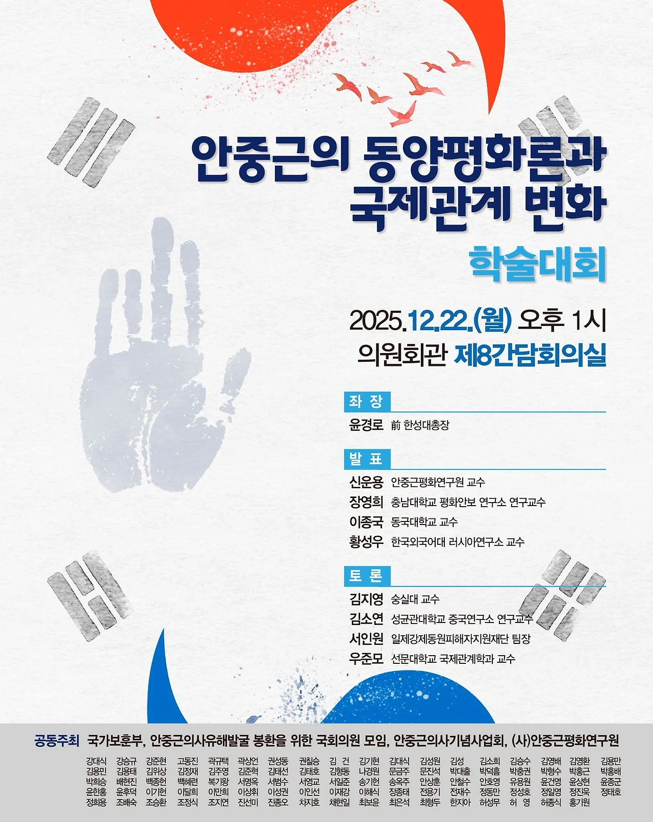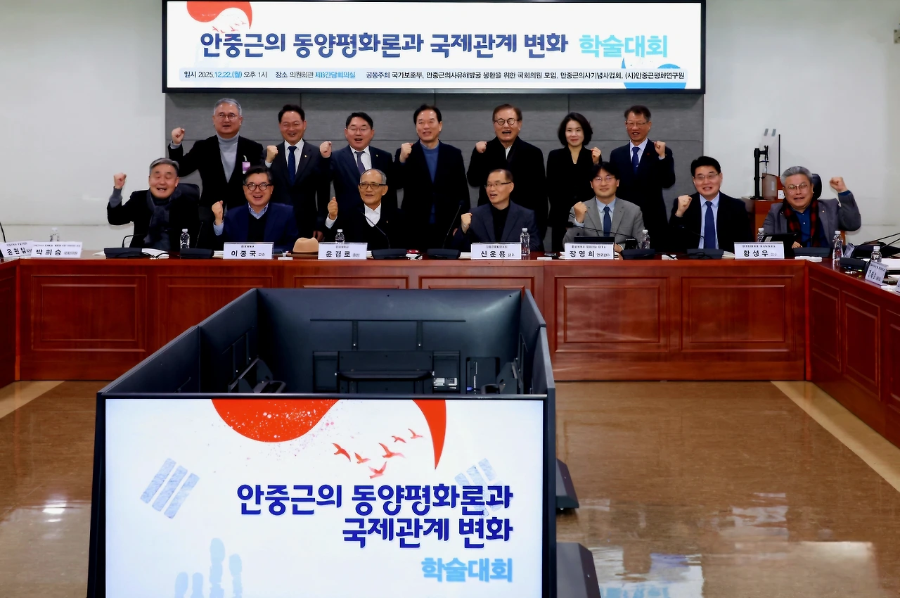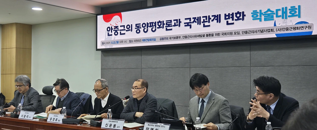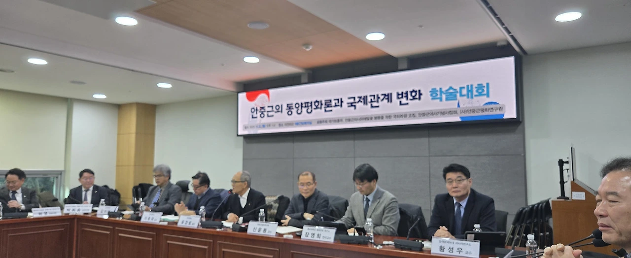 ‘안중근의 동양평화론과 국제관계 변화’ 학술대회가 22일 서울 여의도 국회에서 열렸다. 이날 좌장은 윤경로 한성대총장이 맡았으며 신운용 안중근평화연구원 교수, 장영희 충남대학교 평화안보 연구소 연구교수, 이종국 동국대학교 교수, 황성우 한국외국어대 러시아연구소 교수가 발표를 진행했다. 토론 패널에는 김지영 숭실대학교 교수, 김소연 성균관대학교 중국연구소 연구교수, 서인원 일제강제동원피해자지원재단 팀장, 우준모 선문대학교 국제관계학과 교수가 참여했다.
