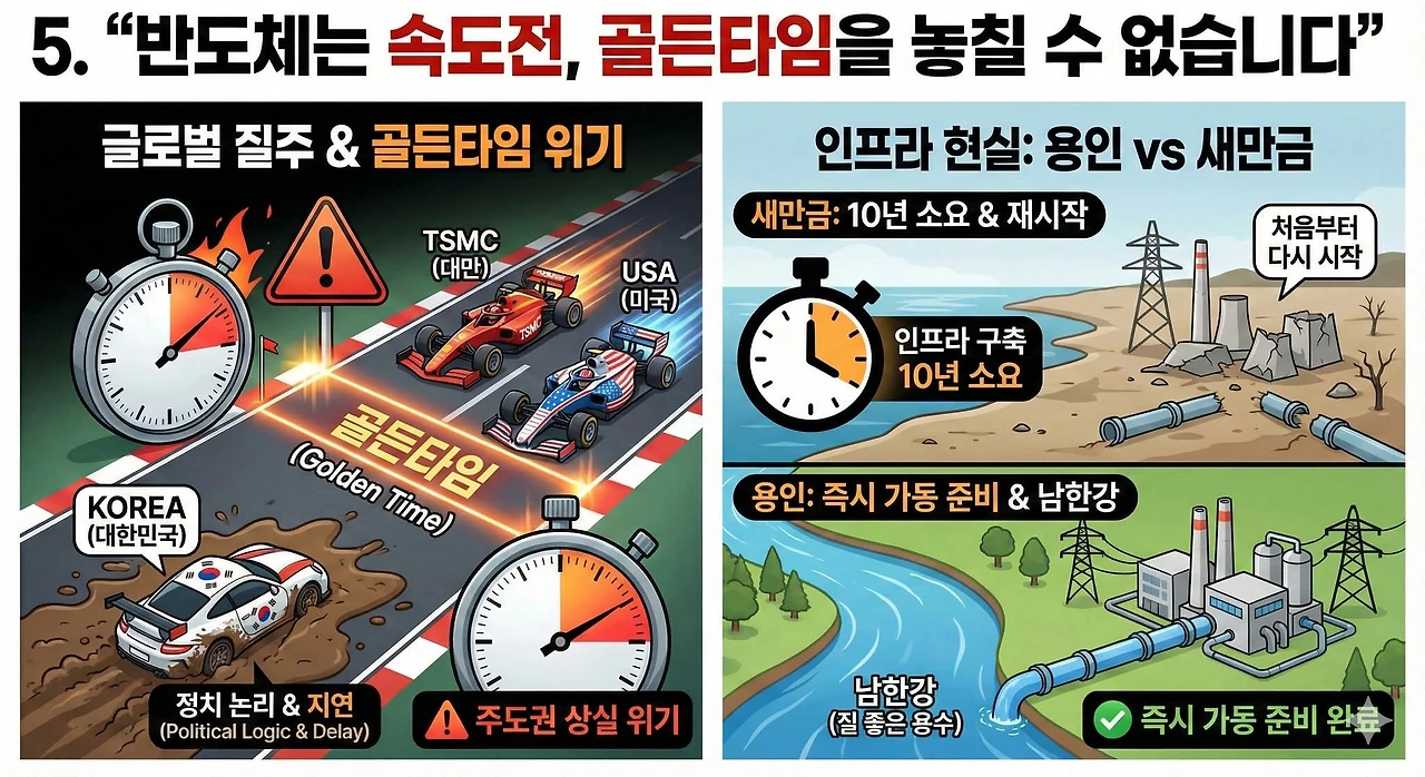 이들은 재생에너지 사용을 강조하는 RE100과 지역균형발전을 주요 근거로 내세운다. 탈탄소 정책과 균형발전 필요성에는 공감대가 크지만, 갑자기 튀어나온 반도체 공장 이전 주장은 기술적·경제적 현실을 외면한 접근이라 우려스럽다. 자칫하면 국가 핵심 산업의 경쟁력을 스스로 약화시켜 이른바 ‘황금알 낳는 거위 배를 가르는 어리석음’이 될 수 있다.