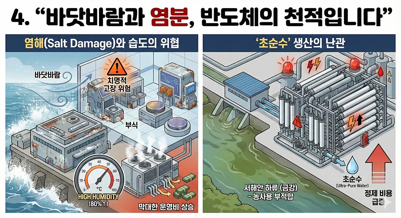 전력 수급 측면에서 보더라도 새만금 이전론은 비현실적이다. 삼성전자와 SK하이닉스의 신규 반도체 공장 중에 3분의 1만 이전하더라도 약 5GW의 전력이 필요하다. 그러나 새만금 지역이 확보한 태양광 발전 설비 용량은 약 0.1GW에 불과하다. 국내 태양광 설비 이용률이 약 15.4%에 그친다는 점을 고려하면, 5GW의 안정적인 전력 공급을 위해서는 총 32.5GW 규모의 태양광 설비를 새로 구축해야 한다.