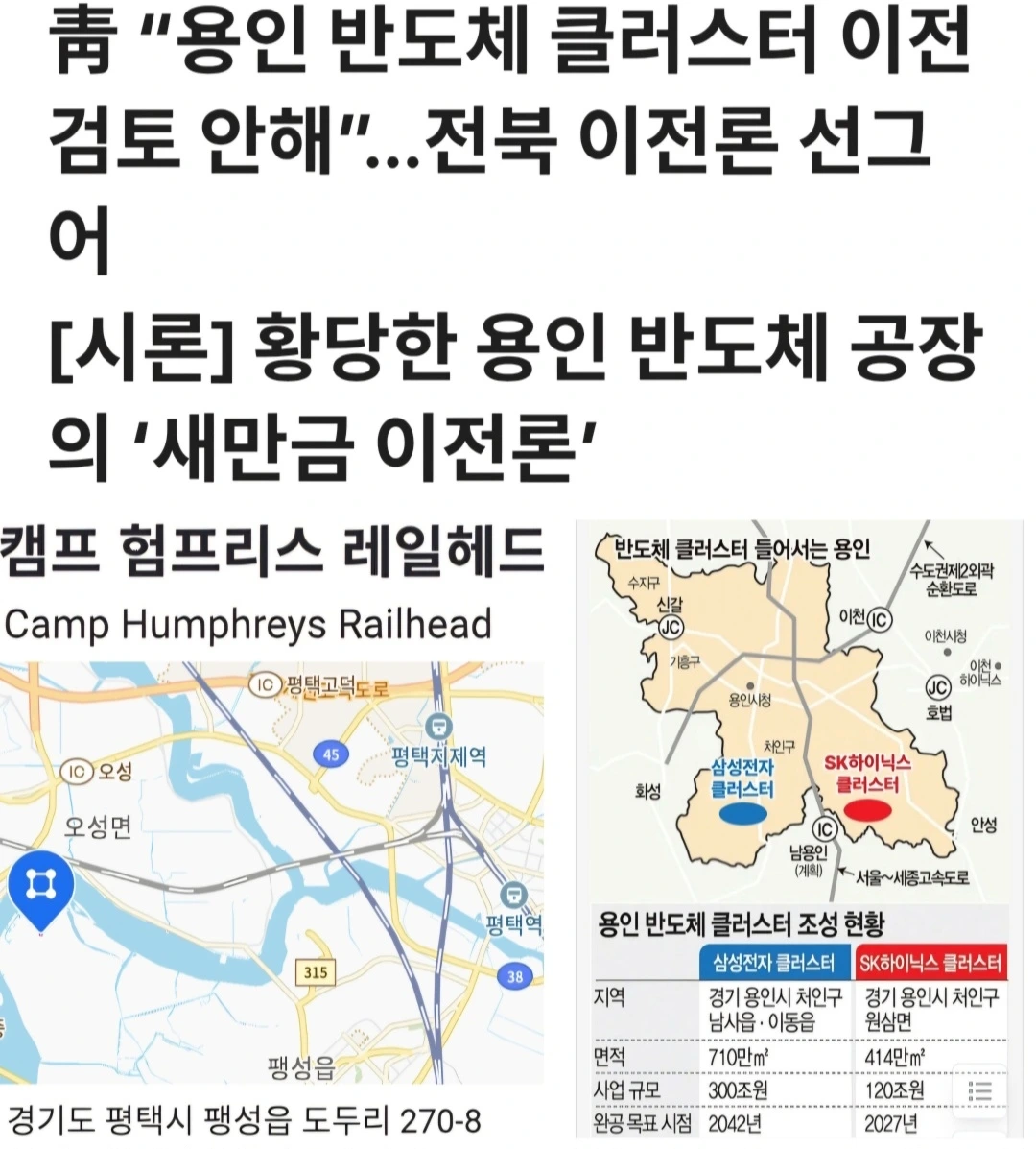 바로 인근 평택(거리로 30km) 주한 미군 기지 '캠프 험프리스 레일헤드'와 한 묶음이 되면서, 미국 정부가 미국 반도체 산업과도 긴밀히 연결되어 있는 이 반도체 클러스터를 지키기 위해서라도(설사 그 대통령이 트럼프일지라도) 함부로 주한 미군 철수를 감행하지 못하도록 만든다는 점과 동시에 바로 그 수만 명에 이르는 평택 주둔 주한 미군 때문에 김일성 집안이 대남 침탈은 물론이고 반도체 클러스터를 상대로 하는 불장난을 칠 수 없게 막는(사실 시진핑의 중국이 대만 침공하려는 것도 TSMC가 탐이 나서 아닌가), 이 두 가지 효과를 동시에 거두고 있다고 보는 까닭이다.