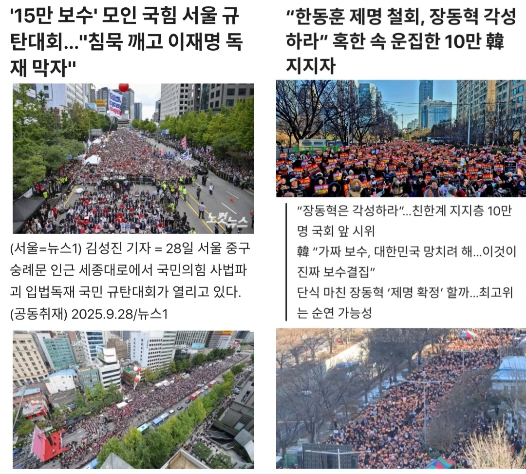 그래서 지난해 9월 28일 세종대로에서 장동혁 지도부가 주최해서 가졌던 15만 명이 참석했다는 '국민의힘 사법파괴 입법독재 국민 규탄대회' 기사 사진을 가져와 본다.