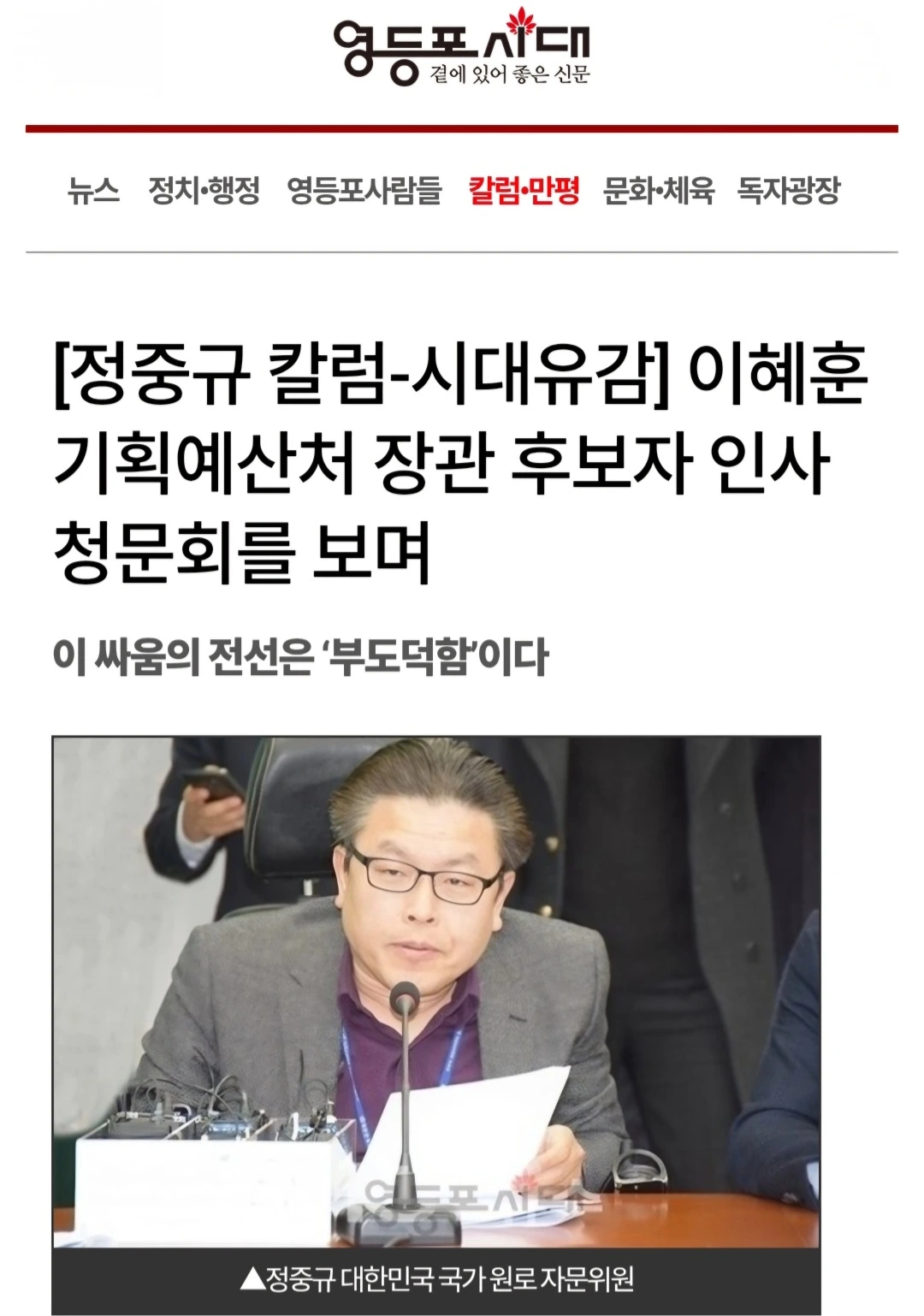[정중규 칼럼/시대유감] 이혜훈 기획예산처 장관 후보자 인사청문회를 보며